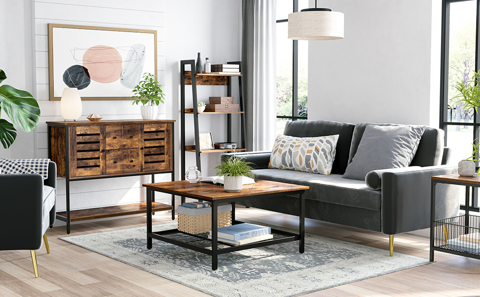 Specificatii:   	 Culoare: maro rustic, negru  	 Material: Placi aglomerate, cadru de otel  	 Dimensiune produs: 80 x 80 x 45 cm (L x l x H)  	 Greutate produs: 11,2 kg  	 Max. Capacitate de incarcare statica: masa 40 kg, raft cu plasa 5 kg    Despre acest articol Luati o suprafata rustica calda, adaugati un cadru de otel negru si prindeti un raft din plasa. Rezultatul? O masuta de cafea industriala care atrage cu usurinta atentia oaspetilor tai, usurand conversatia cu cafeaua datorita acestui punct de discutie.Invitati-va prietenii pentru o dupa-amiaza distractiva de jocuri de societate sau o seara de film; aceasta masa mare cu un raft de plasa inferior va fi insotitorul perfect pe care sa jucati confortabil dame si sa beti gustari si bauturi.Stabilitatea este prioritara atunci cand vine vorba de mese. Cu picioare reglabile, aceasta masuta de cafea poate ramane mereu echilibrata, astfel incat cafeaua sa nu se reverse din cauza clatinarii de fiecare data cand iei niste gustari sau pui niste carti pePrietenii tai vor veni la o petrecere intr-o ora? Nu va panicati. Cu o structura simpla, piese numerotate si instructiuni clare, puteti finaliza asamblarea si puteti pune gustari inainte de inceperea petrecerii.O masuta de cafea de 80 x 80 x 45 cm realizata cu un cadru robust din otel si placi aglomerate de calitate din Colectia noastra INDESTIC de VASAGLE pentru a va reinventa camera de zi.