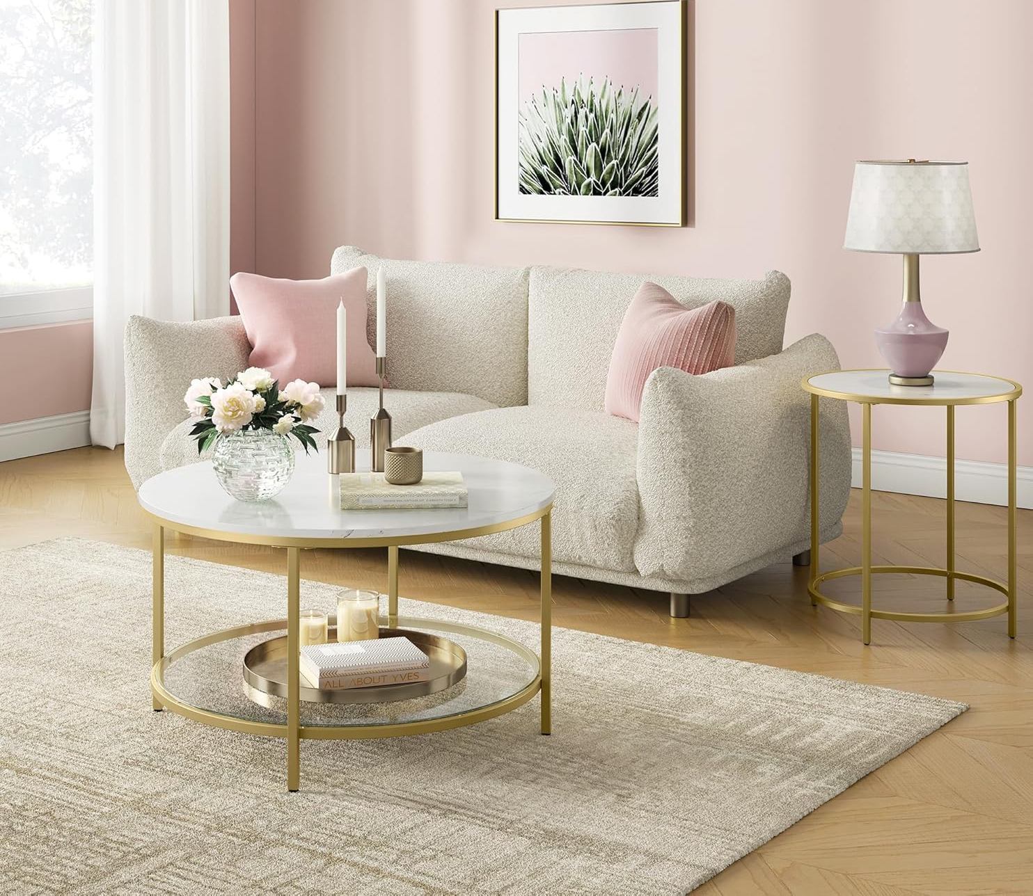 VASAGLE Masa de cafea rotunda cu blat din imitatie de marmura, polita suplimentara din sticla, 80x45cm, alb si auriu