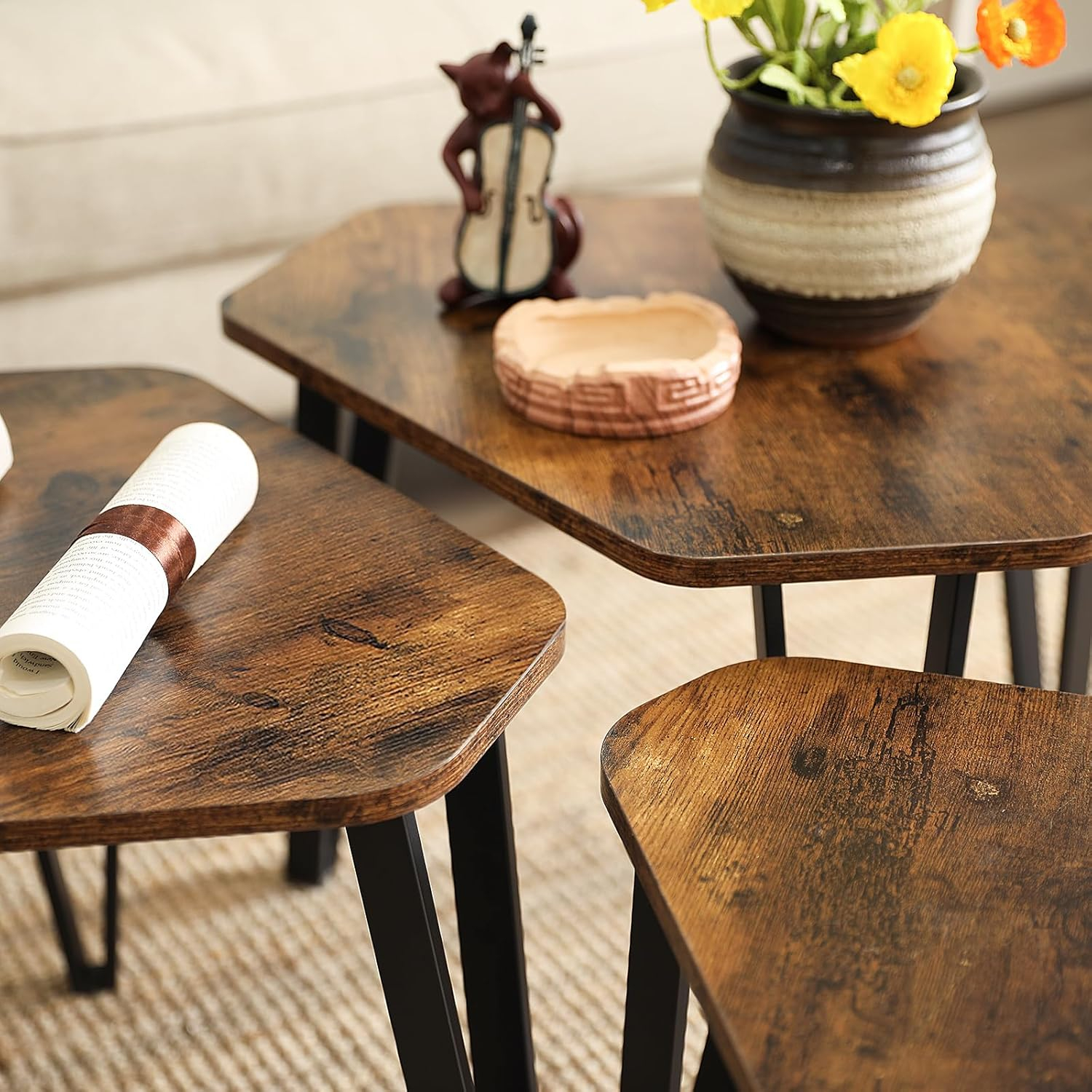 Un farmec rustic: Blaturile din lemn maro rustic emana un strop de stil clasic de altadata, iar cadrele rigide din otel confera un aer industrial. Acum acestea se reunesc in acest set de mese pentru a aduce vibratii pozitive in casa ta