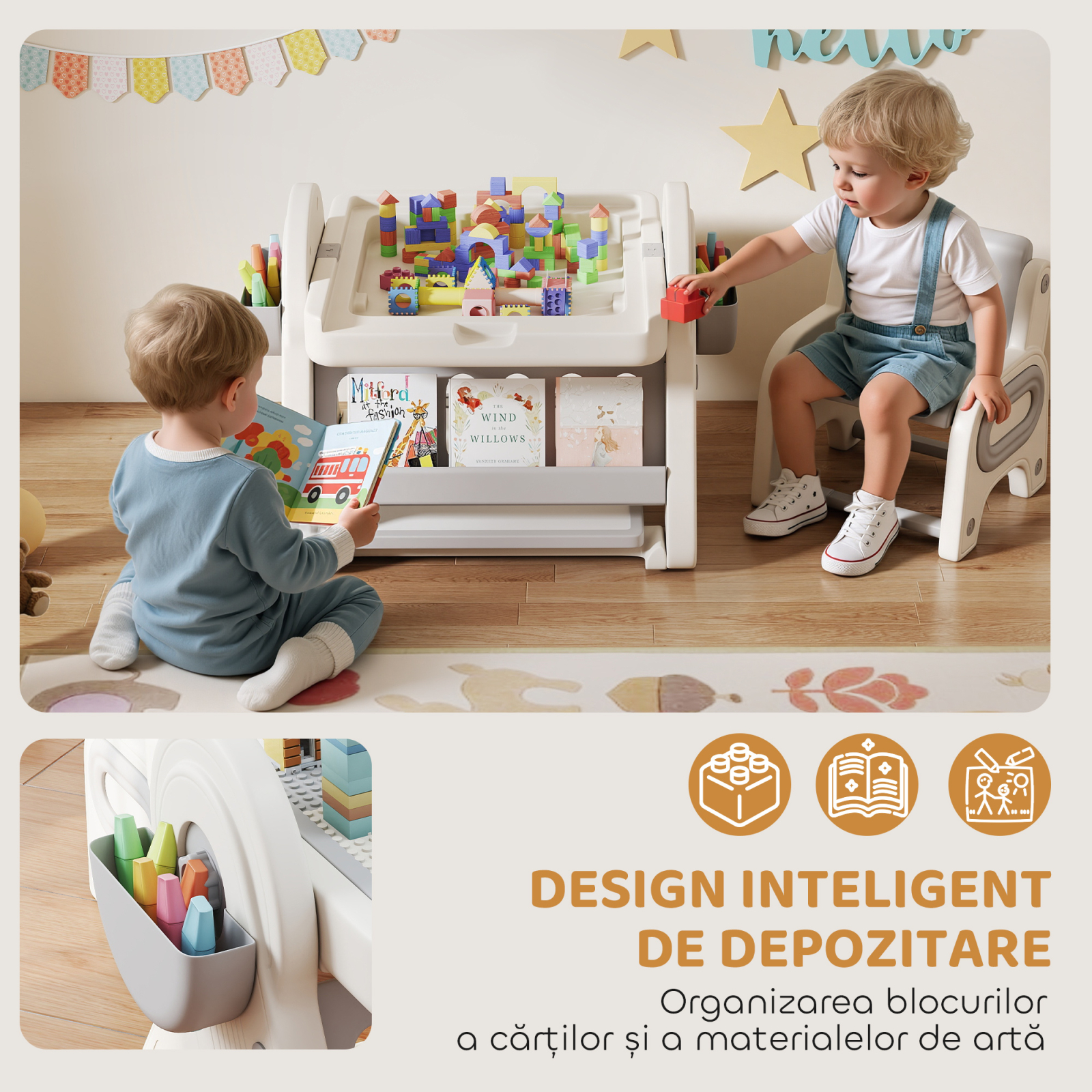 Lasati-va cucerit de setul de masa si scaune pentru copii [BRAND NAME], conceput pentru momentele de joaca si studiu ale celor mici din casa. Lasati copiii sa se joace pe partea pentru constructii sau sa se bucure de lectura si desen pe partea neteda a mesei. Raftul ascuns este util pentru a aranja multe jucarii si obiecte, in timp ce blatul se poate transforma intr-un suport, stimuland creativitatea si invatand valoarea ordinii.