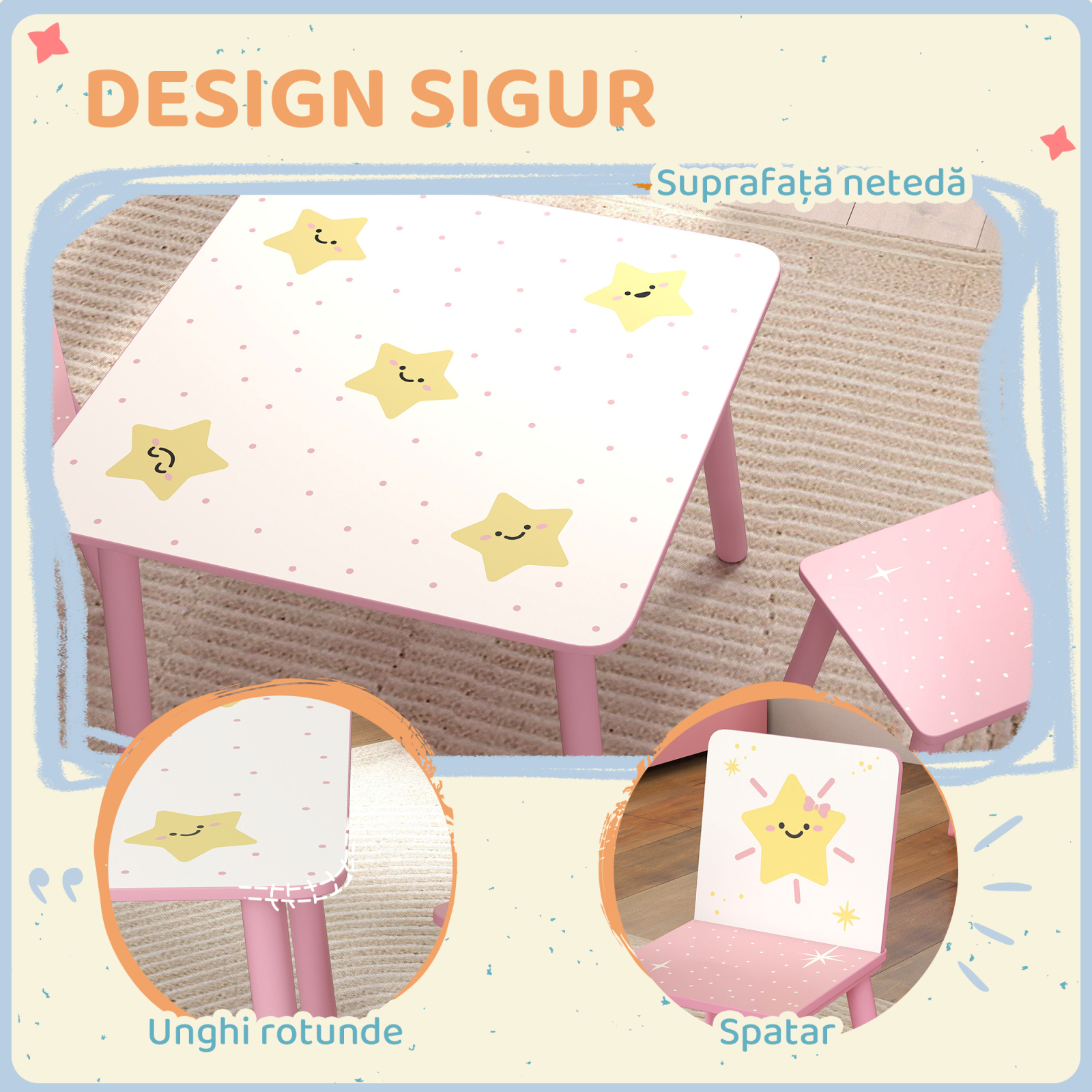 Fa fiecare zi a micutilor tai stralucitoare cu setul de masa si scaune pentru copii [BRAND NAME] de 3 piese, perfect pentru cei mici de la 3 ani in sus. Ideal pentru desenat, citit sau jucat, are o finisare roz cu decoratii stelare si margini rotunjite pentru a asigura siguranta si confortul. Usor de mutat, setul cu scaune si masa pentru copii se potriveste minunat in orice sala de jocuri sau camera de copii. Stimuleaza mintile tinere in fiecare zi!