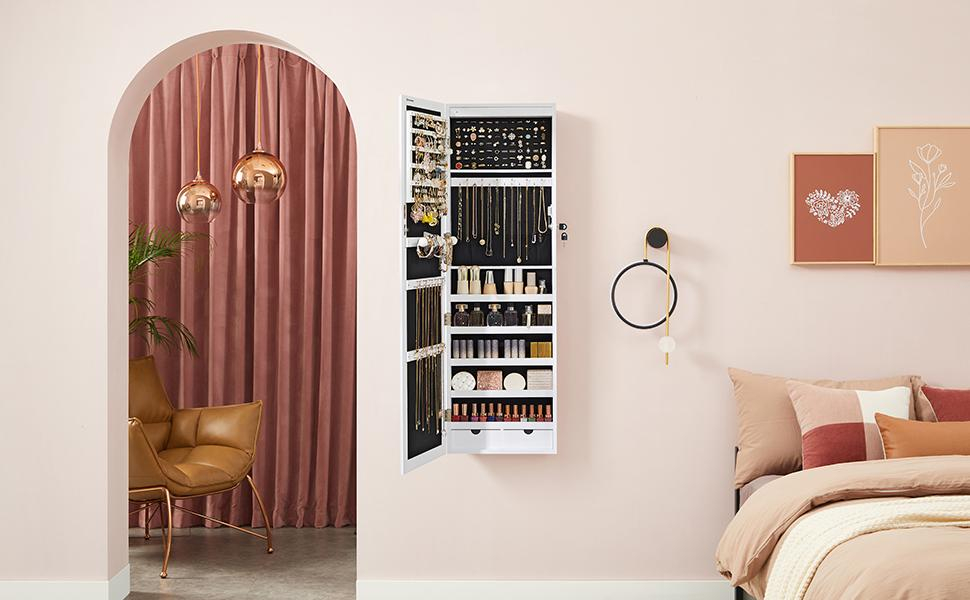 Puteti plasa pur si simplu acest dulap de bijuterii suspendat pe rama usii, folosind suporturile incluse, sau pur si simplu il puteti fixa pe un perete solid folosind suruburile furnizate; veti economisi mai mult spatiu in ambele cazuri.