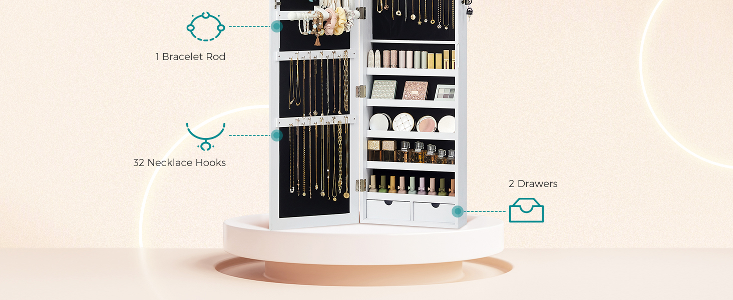 84 de locuri pentru inele, 90 de fante pentru cercei, 48 de gauri pentru cercei, 32 de carlige pentru coliere, 5 rafturi, 2 sertare si 1 tija pentru bratari, toate intr-un singur loc.
