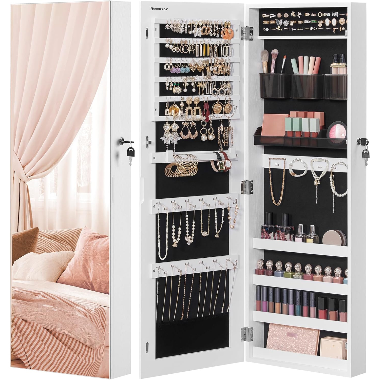Brius Dulap pentru bijuterii, cu oglinda design fara rama, MDF, montare pe perete sau usa, 37x10x108 cm, alb