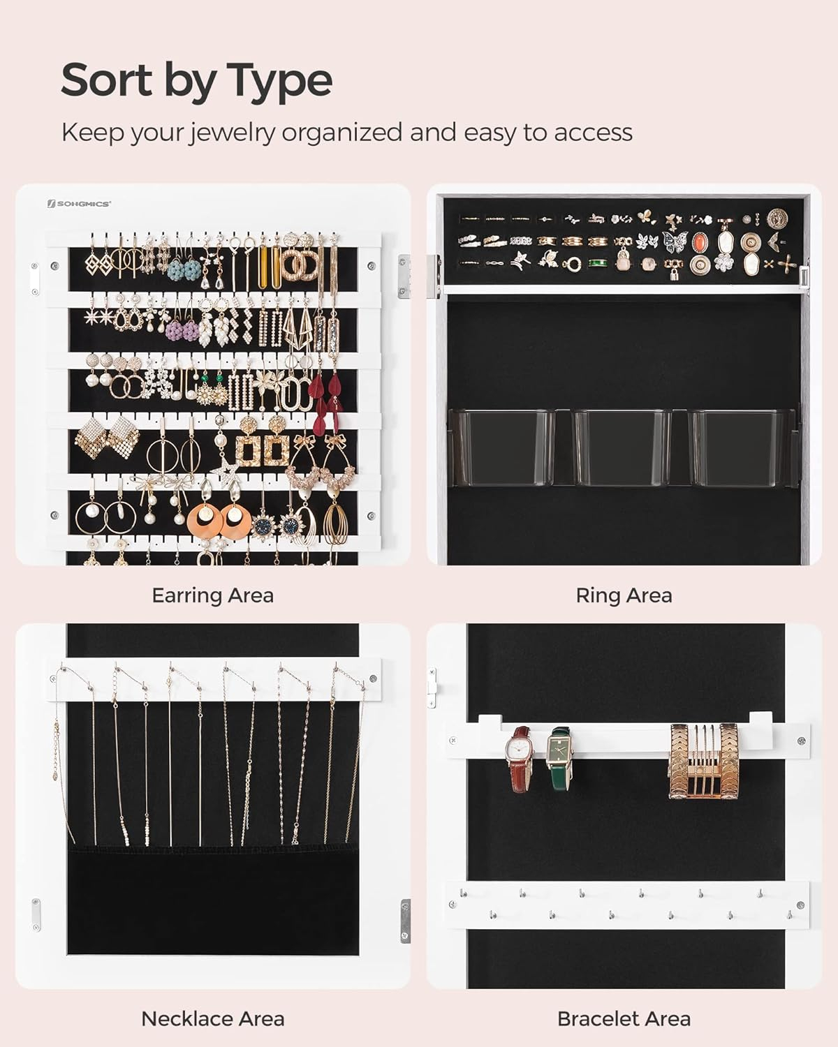 • Numeroase suporturi pentru cercei, coliere, inele si bratari