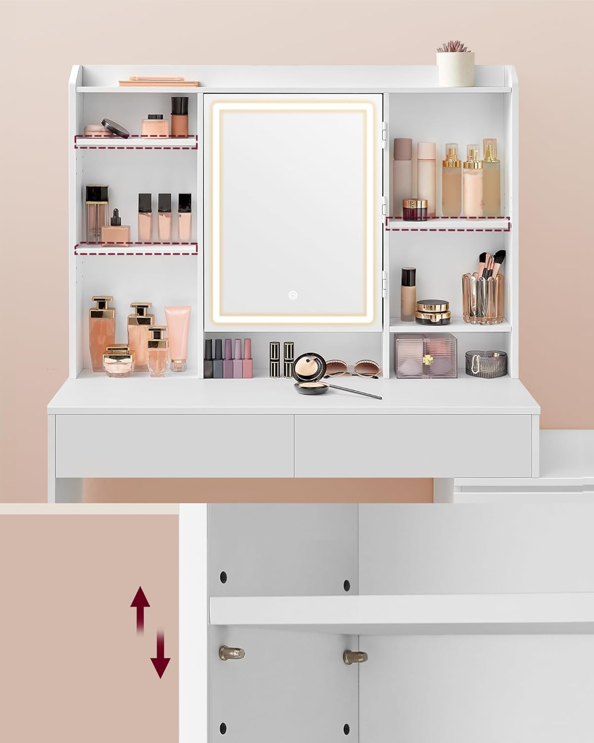 O multime de spatiu: Un raft superior, 7 compartimente deschise, 2 sertare mari, 2 carlige in spatele oglinzii, un blat de masa mare si un dulap cu 4 sertare. Aceasta masuta de toaleta ofera mult spatiu de depozitare – totul are locul sau.