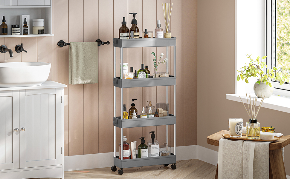 Detalii despre produs: Culoare: Gri Material: PP (polipropilena), tuburi metalice Dimensiuni totale: 12,5 x 40 x 88 cm (D x l x h) Greutate: 1,3 kg Capacitate maxima de incarcare statica in total: 20 kg (5 kg pe nivel) Despre acest articol Acest carucior de depozitare cu dimensiuni de 40 x 12,5 x 88 cm se poate potrivi in spatiile inguste din bucatarie, baie, dormitor sau spalatorie, pentru a va ajuta sa profitati la maximum de spatiul dvs.Datorita celor 4 roti pivotante netede, puteti muta caruciorul oriunde aveti nevoie de el, utilizand spatiul din colt pentru a organiza sticlele de condimente sau consumabilele pentru baie.Acest carucior de bucatarie este prevazut cu 6 carlige detasabile pentru a agata prosoape de bucatarie, sau spatule pentru acces usor si depozitare flexibila.Caruciorul cu 4 nivele poate fi impartit in doua rafturi cu 2 nivele, sau intr-o tava si un carucior cu 3 nivele, astfel incat puteti decide daca sa le folositi – pe chiuveta pentru consumabilele de baie sau pe blatul de bucatarie pentru a tine sticlele.Cu instructiuni ilustrate si piese usor de distins, acest raft de depozitare din plastic cu 4 niveluri este usor de asamblat fara.
