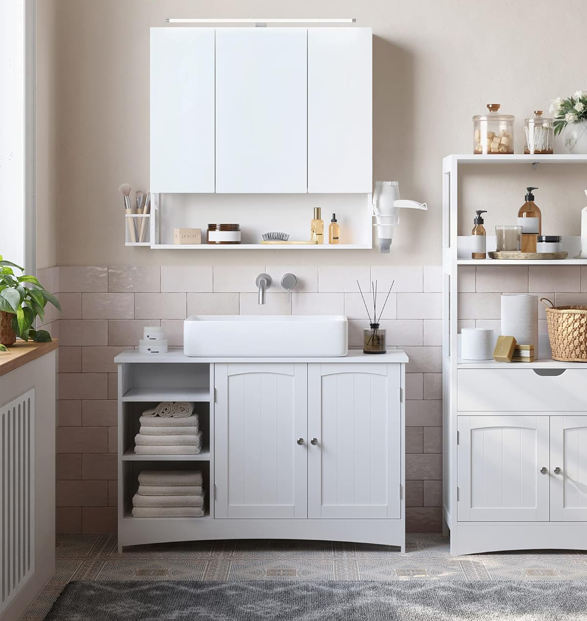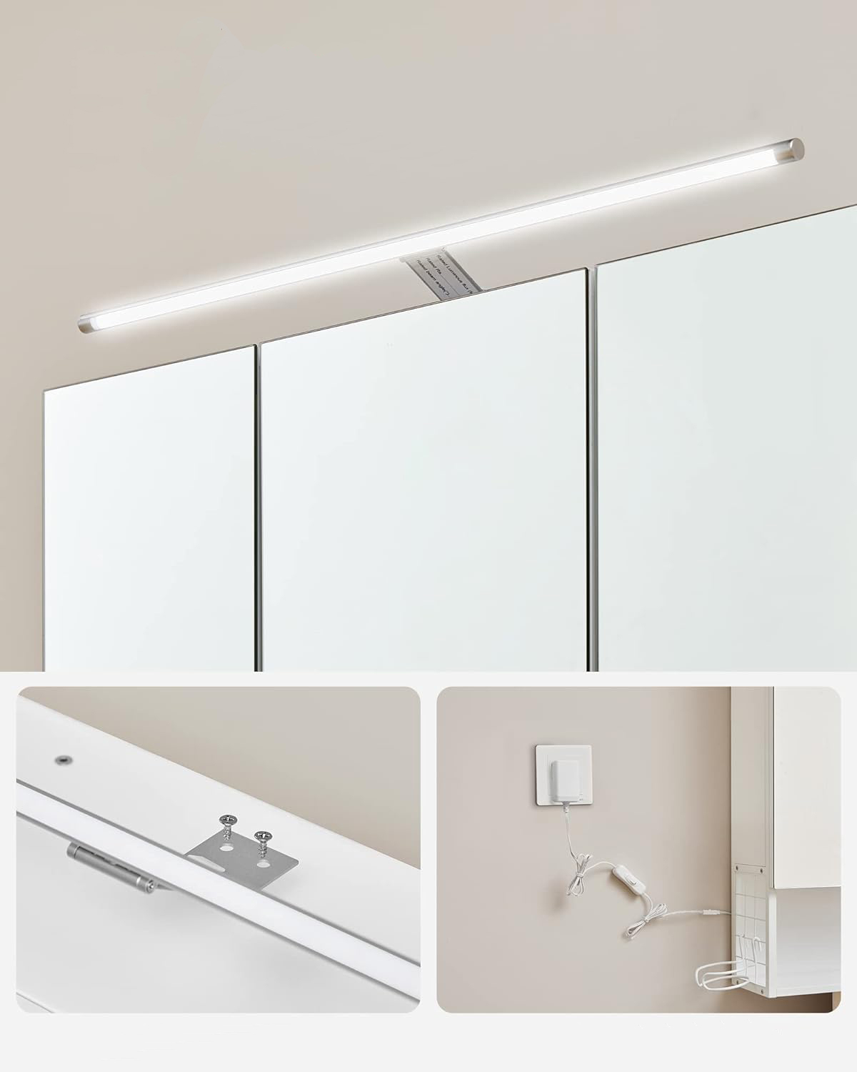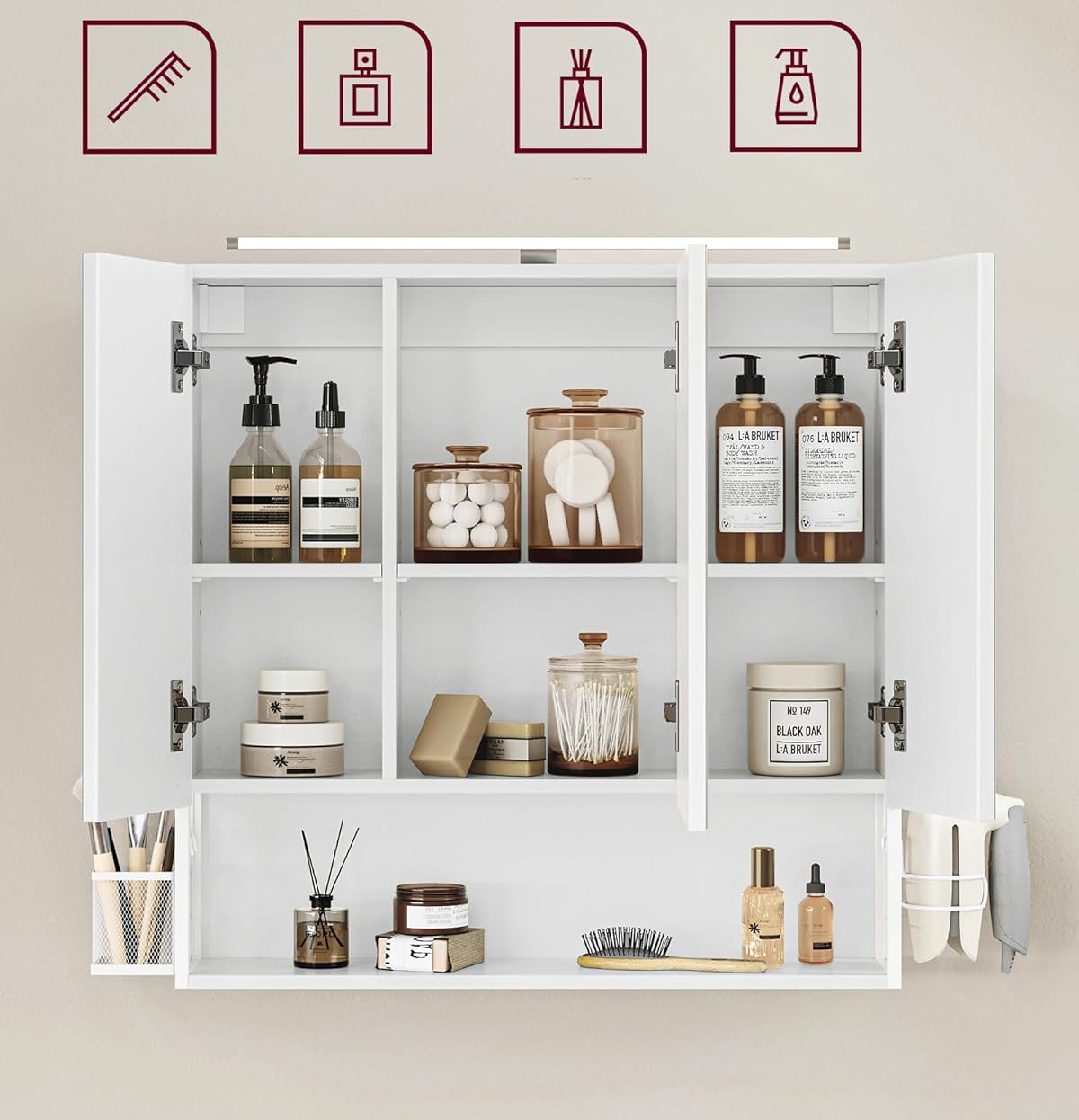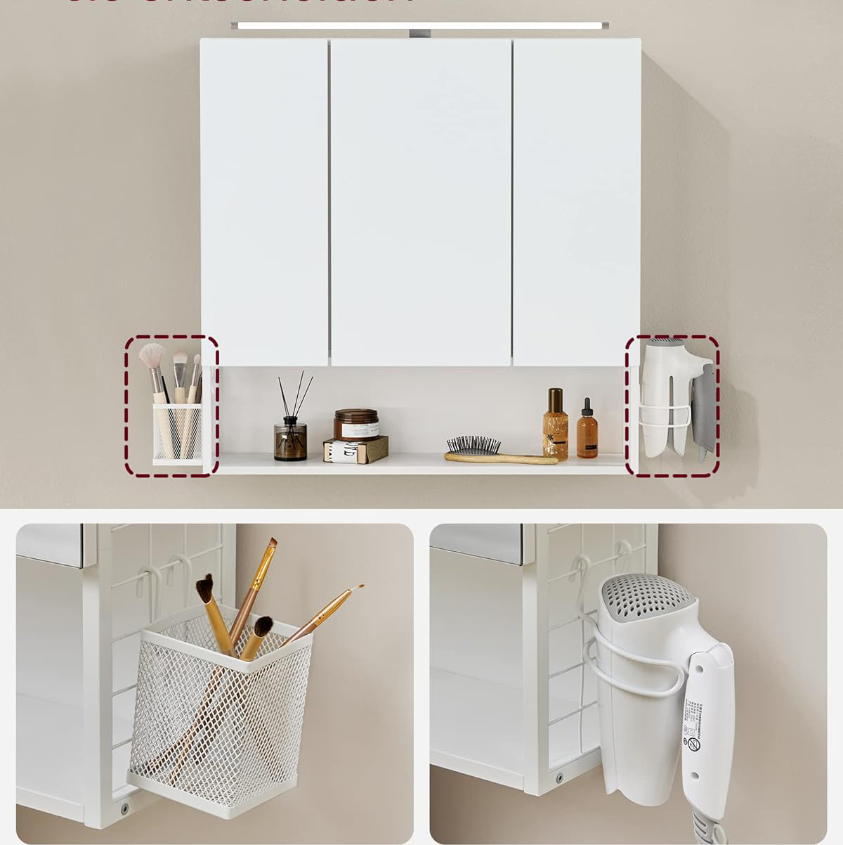 Detalii produs: Culoare: alb Material: placi aglomerate, otel, sticla Dimensiuni: 14,5 x 70 x 70 cm (D x W x H) Inaltimea lampii: 5 cm Greutate: 14,8 kg Capacitate maxima de incarcare statica a raftului superior: 20 kg Capacitate maxima de incarcare statica a nivelului raftului reglabil: 5 kg Capacitate maxima de incarcare statica a compartimentului deschis: 5 kg Despre acest articol Culoarea alb nor are un aspect luxos, iar grilele laterale adauga un stil deosebit. Puteti da baii dvs. un aspect nou cu acest dulap de baie.Cos suspendat si suport pentru uscator de par: O parte este echipata cu un cos mic suspendat, care este convenabil pentru obiectele dvs. mici, iar pe cealalta parte exista un suport pentru uscator de par, care faciliteaza utilizarea uscatorului de par.Partea superioara a dulapului cu oglinda este echipata cu o bara de lumina, astfel incat sa va puteti finaliza cu usurinta rutina zilnica de ingrijire a pielii si machiaj.Ascundeti-va secretele in spatele usilor oglinzii, care nu numai ca va protejeaza intimitatea personala, dar adauga si o frumusete simpla baii dvs.Compartimentul deschis din partea de jos este convenabil pentru a va stoca articolele necesare zilnic, astfel incat sa le puteti accesa in orice moment. Acest lucru aduce mai multa flexibilitate vietii dvs.