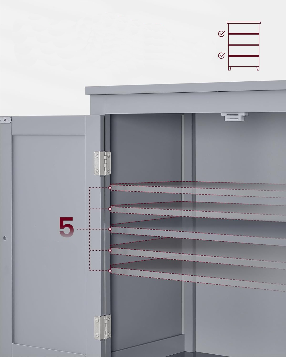 Specificatii: Culoare: Gri Material: MDF (placi de fibra de densitate medie) Dimensiunea produsului: 30 x 60 x 110 cm Greutatea produsului: 16,8 kg Max. Capacitate de incarcare statica a blatului: 136 kg Despre acest articol O multime de spatiu de depozitare: Acest dulap de baie are un dulap superior si unul inferior pentru a oferi spatiu amplu pentru uscatorul de par, prosoapele, cosmeticele, articolele de dus si multe altele.Depozitare personalizabila: Reglati cu usurinta raftul din fiecare dulap in 5 pozitii diferite, oferind flexibilitatea de a gazdui articole de diferite inaltimi.Combina calitatea si stilul: Realizata din MDF de inalta calitate si echipata cu un dispozitiv anti-inclinare, aceasta unitate de depozitare pentru baie este durabila si stabila. Panourile sale decorative elegante imbunatatesc aspectul baii dvs.Siguranta garantata: Colturile rotunjite previn loviturile, iar kitul anti-inclinare furnizat va ajuta sa fixati dulapul de baie pe perete.Asamblare fara probleme: Piesele etichetate si instructiunile simple va vor ajuta sa asamblati fara efort acest dulap de baie autoportant.