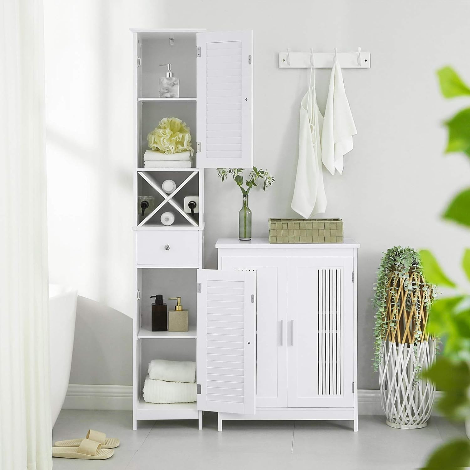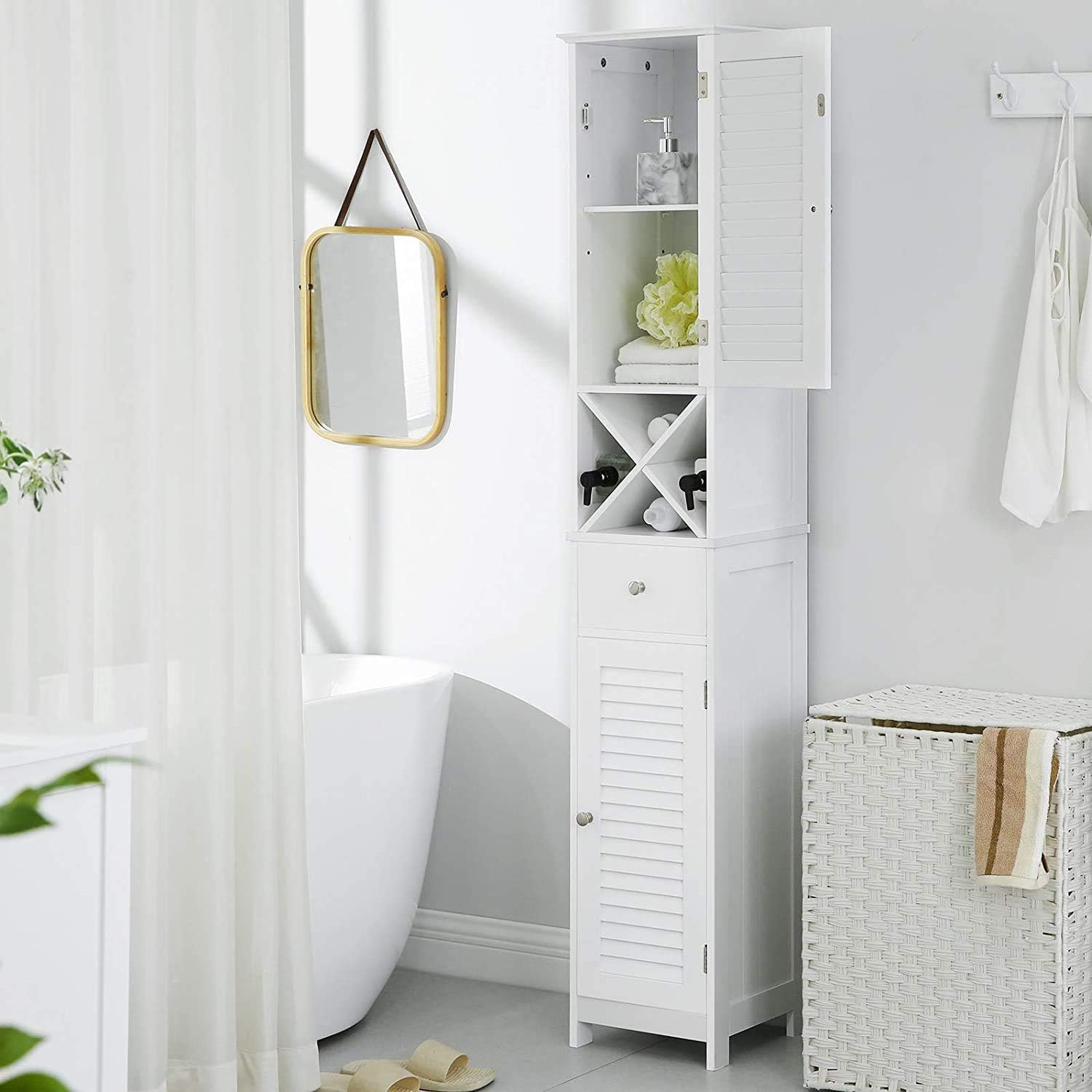 Specificatii: Culoare: alb Material: MDF Dimensiunea produsului: 32 x 30 x 170 cm Max. Capacitate de incarcare statica: 20 kg Despre acest articol Acest dulap de baie alb elegant este fabricat din lemn prelucrat de calitate. Usile cu obloane permit o buna ventilatie si va mentin produsele de ingrijire uscate pentru o utilizare mai placuta.Setati dulapul inalt in dreapta chiuvetei, astfel incat sa puteti deschide in mod convenabil usile pentru a va accesa produsele de toaleta si a va bucura de rutina zilnica de frumusete. Mai aveti cateva maruntisuri imprastiate prin jur? Organizati-le in sertar!Cu o amprenta mica de 32 x 30 cm, acest dulap de depozitare ocupa putin spatiu pe podea, facand in acelasi timp o mare diferenta pentru baia dvs. sau, daca doriti sa adaugati spatiu de depozitare suplimentar in camera de zi sau la intrare, acesta va fi perfect.Au disparut zilele in care va petreceti dupa-amiaza asambland mobila; cu instructiuni detaliate si piese numerotate, o veti monta inainte sa va dati seama; de asemenea, este inclus un kit anti-inclinare pentru a asigura o casa sigura.