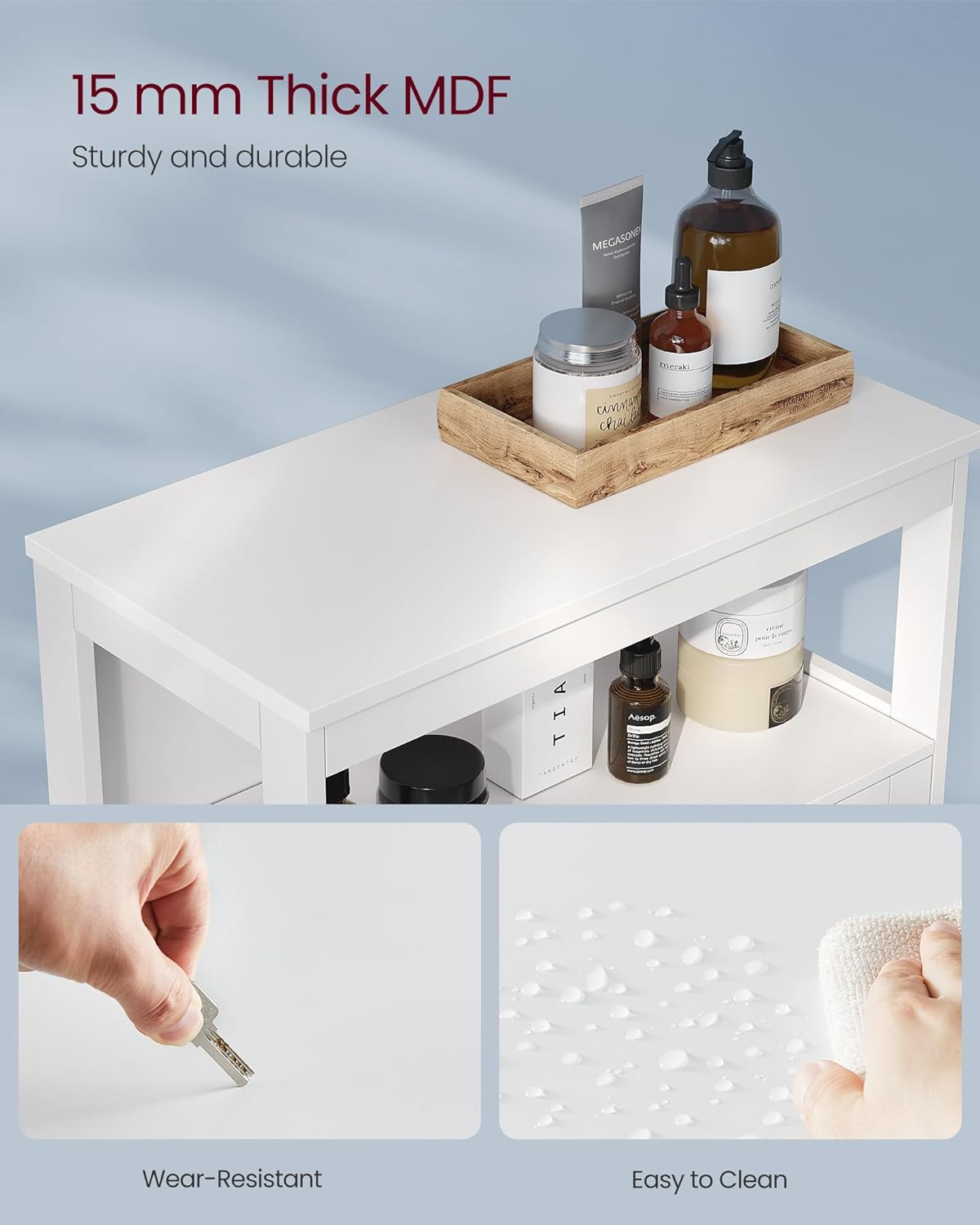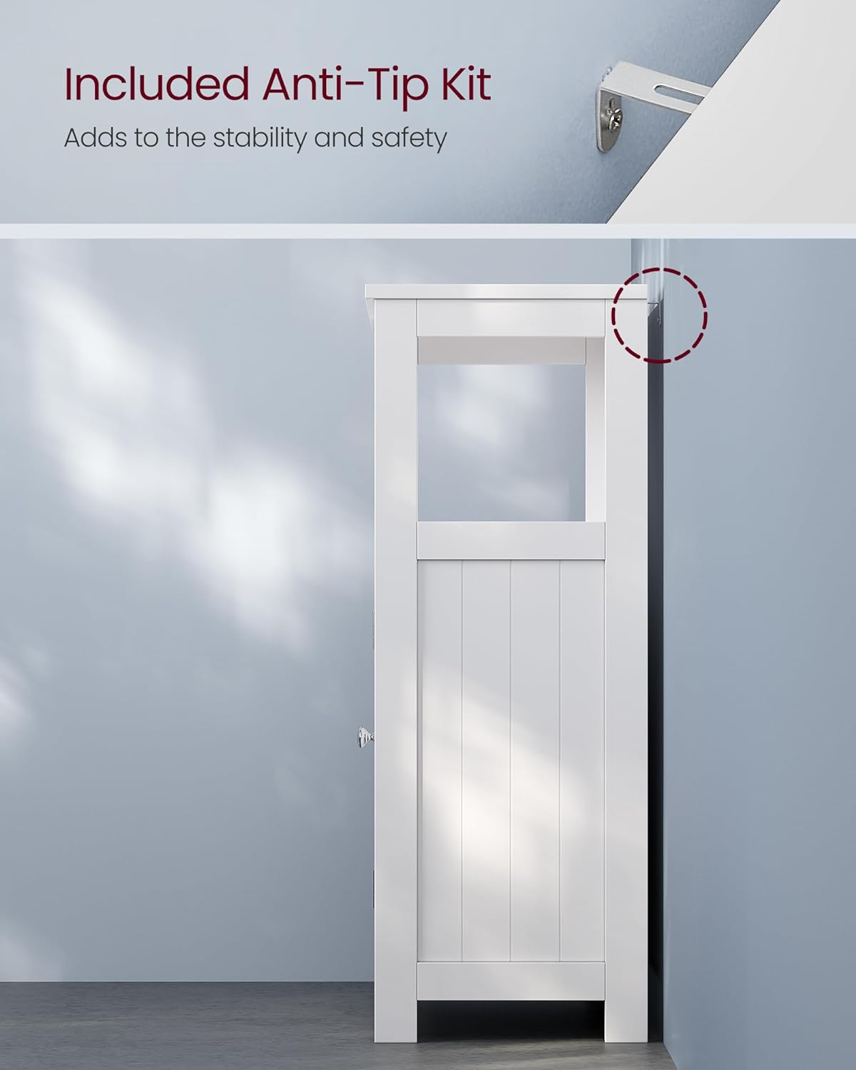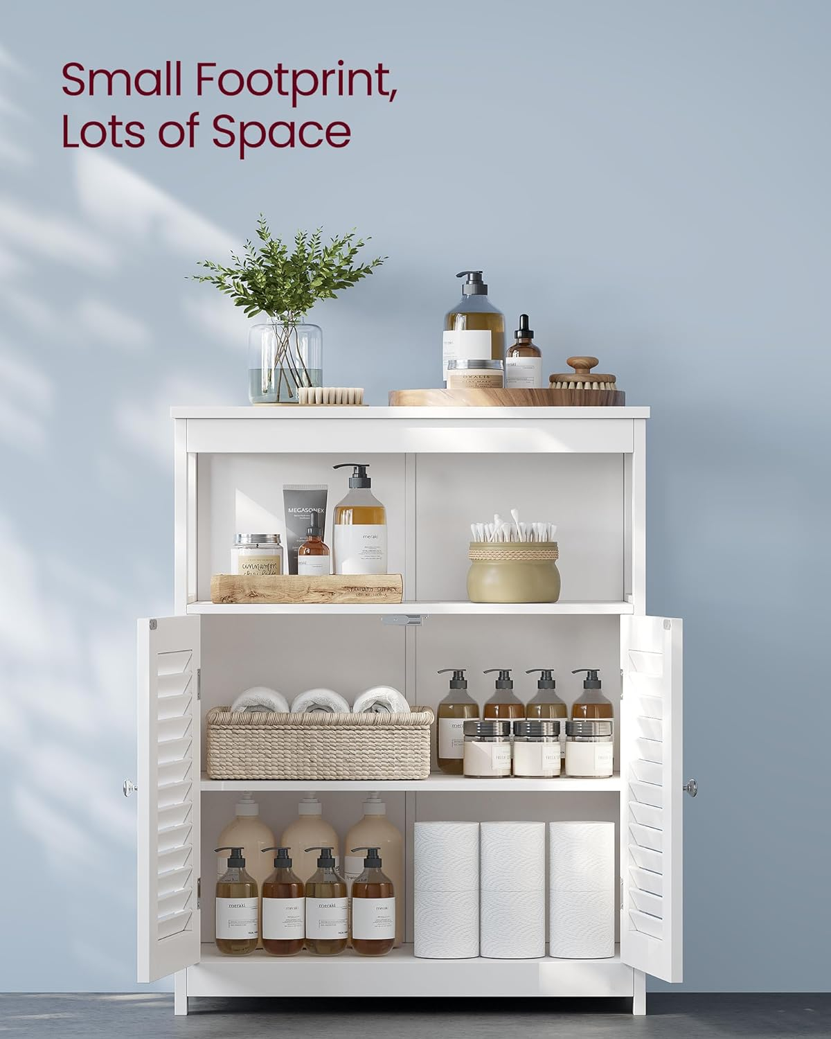 Marca VASAGLE Culoare: alb Dimensiunile produsului: 30D x 60L x 80H cm Caracteristica speciala: durabil Toate elementele acestui dulap se imbina perfect: finisajul alb mat, usile elegante cu lamele si simplitatea generala a profilului; aduce usurinta si o nota de liniste in timpul baii si in rutina de trezire.Pe langa aspectul sau placut, acest dulap de depozitare convinge si prin structura sa. O suprafata usor de curatat, panourile durabile din lemn prelucrat si detaliile rafinate lucreaza impreuna pentru o utilizare de lunga durataFericirea este gata! Deschideti usile sale cu oblon... prosoapele dvs. curate sau hartia igienica suplimentara se afla pe raftul cu 3 optiuni de inaltime. Deasupra ei? Articolele dvs. des folosite se afla in compartimentul deschis. Parfumurile sau produsele esentiale de infrumusetare isi gasesc o scena pe suprafata superioara! Numele acestui dulap de baie este doar o sugestie - foloseste-l in camera de zi ca unitate de depozitare, in holul de la intrare ca raft de intrare sau chiar intr-un colt care altfel ar fi inutil (extrem de versatil).Timpul liber este asigurat: Bucuria de a primi mobilier nou este intotdeauna distrusa de pasii complicati de asamblare? Nu si acest dulap de podea! Datorita unei structuri simple si a instructiunilor pas cu pas, il veti pregati in cel mai scurt timp