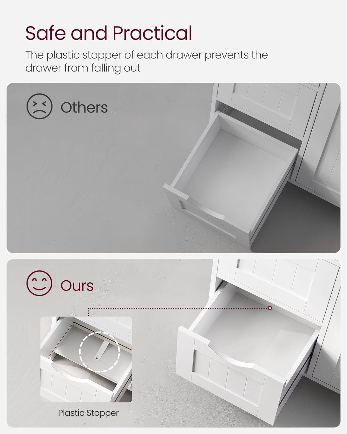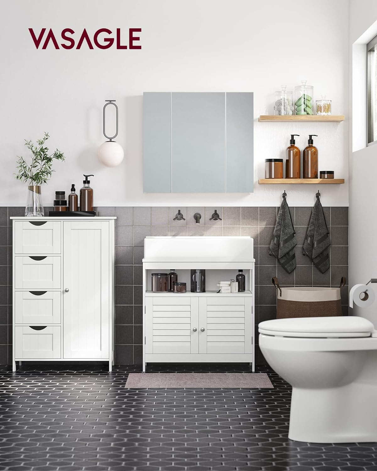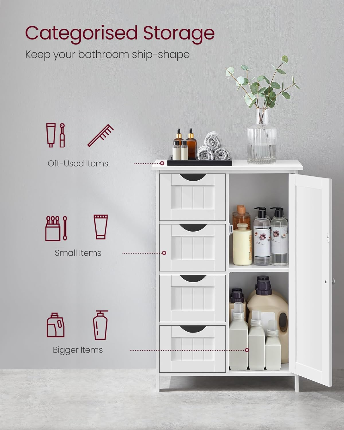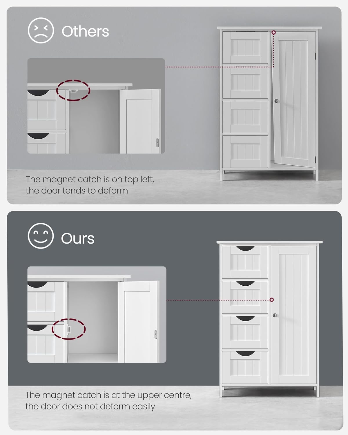 Marca: VASAGLE Culoare: Alb Dimensiuni produs: 30D x 55W x 82H centimetri Despre acest articol Depozitare categorizata: Articolele des folosite pe blat, cele 4 sertare si articolele de diferite dimensiuni merg pe raftul reglabil (disponibile in 3 inaltimi) din spatele usii - acest dulap de baie va va oferi o baie ordonata.Robust si sigur: Fabricat din MDF robust, acest dulap de depozitare pentru baie este robust si stabil; trusa anti-rasturnare de pe spatele acestui dulap de depozitare sporeste stabilitatea si siguranta generala.Compact, dar spatios: Cu o forma compacta, aceasta unitate de depozitare pentru baie ocupa doar 30 x 55 cm spatiu pe podea, oferind in acelasi timp mult spatiu de depozitare. Cu aceasta unitate, puteti folosi pe deplin spatiul ingust de baie.Adaugare frumoasa la orice camera: Culoarea alba eleganta si un design simplu fac o unitate de depozitare ingrijita si eleganta, care se potriveste frumos cu decorul casei tale, fie ca este vorba de baie, sufragerie sau hol.Nu va faceti griji pentru asamblare! Piesele numerotate si instructiunile usor de urmat fac din acest dulap de baie de sine statator asamblat usor.
