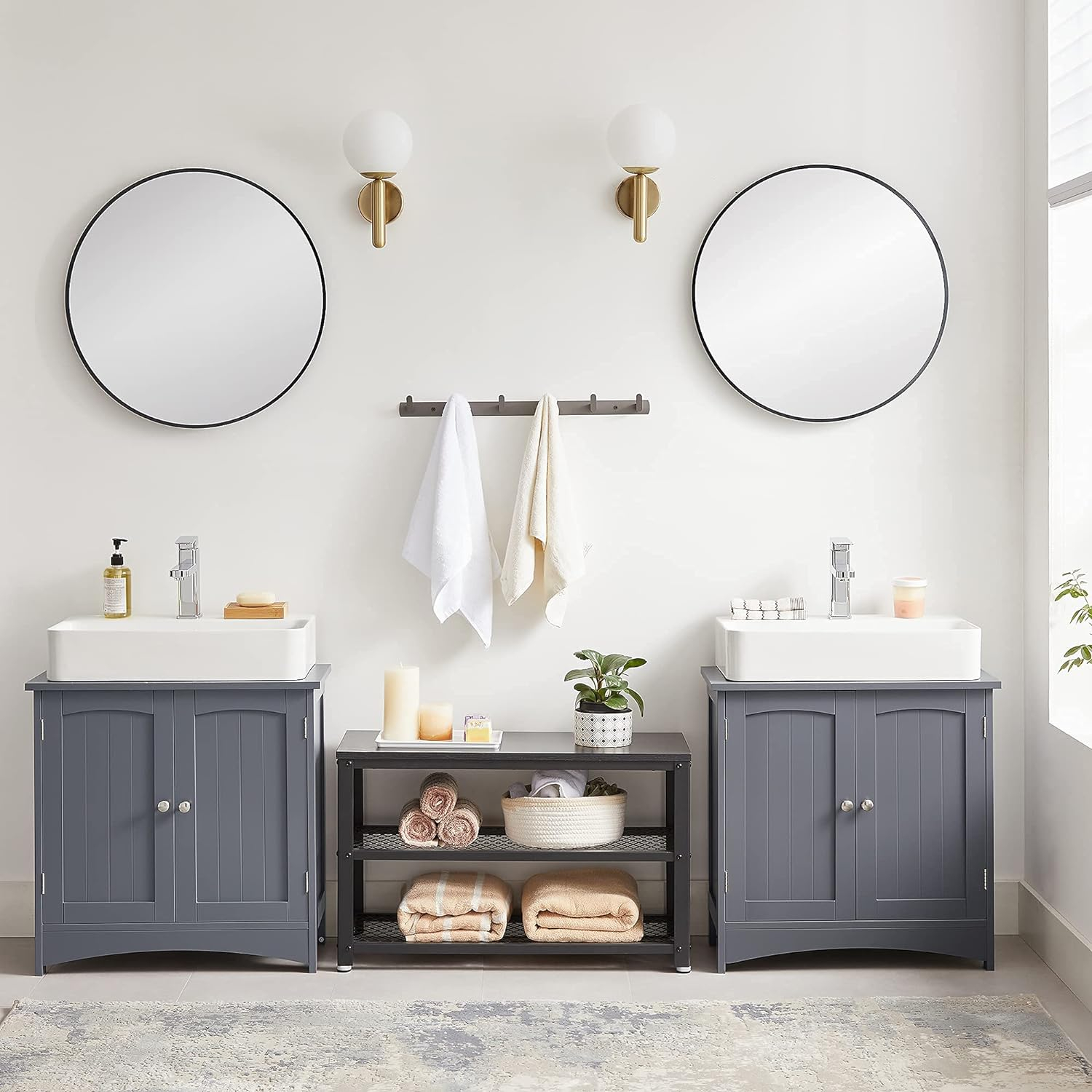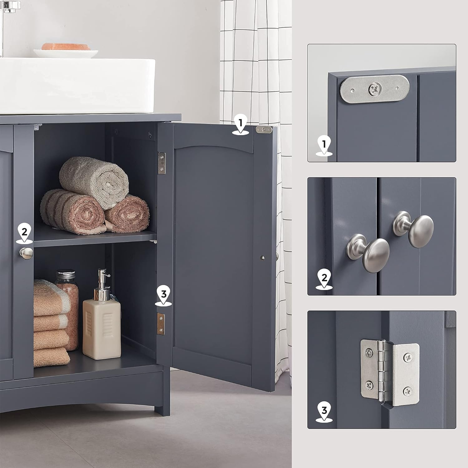 Specificatii:   	 Culoare: Gri  	 Material: MDF (panou de fibre de densitate medie)  	 Dimensiunea produsului: 30 x 60 x 60 cm (D x L x H)  	 Dimensiunea decupajului: 20 x 15 cm (P x L)  	 Greutatea produsului: 9,4 kg  	 Continutul pachetului:  	 1 x Dulap  	 1 x Kit de accesorii  	 1 x Instructiuni    Despre acest articol Acest dulap de baza realizat din panouri MDF de inalta calitate este solid si durabil; protectia la inclinare inclusa garanteaza, de asemenea, stabilitate si siguranta.Spatiul interior de depozitare este impartit in 2 compartimente de un raft reglabil pe 3 nivele. Articolele de diferite dimensiuni se potrivesc bine in dulap. Profitati la maxim de spatiul din baie sau de sub chiuveta.In spatele usilor, pot fi depozitate prosoape, produse de curatare, hartie igienica si alte ustensile.Cu o dimensiune de 20 x 15 cm, deschiderea pentru sifon este suficient de mare si potrivita pentru diferite tipuri de chiuvete.Urmati instructiunile detaliate si asamblati pas cu pas acest dulap de baza pentru chiuveta. Piesele individuale sunt bine marcate, astfel incat sa nu va incurcati.