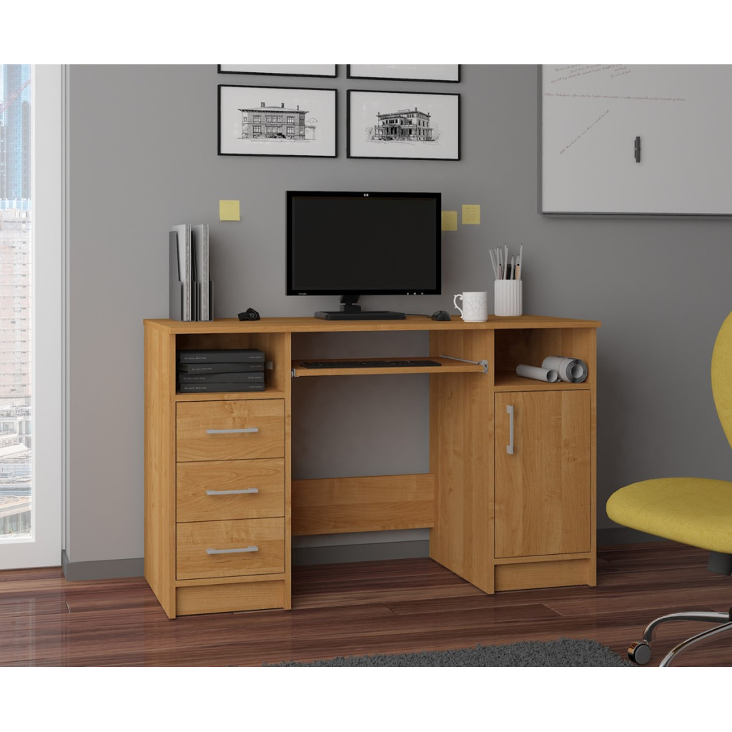 Biroul este o solutie practica pentru birou sau camera de studiu. Ofera spatiu generos pentru lucru si multiple compartimente pentru organizarea eficienta a documentelor si accesoriilor. Include 3 sertare, un dulap cu polita interioara si o polita glisanta pentru tastatura, toate concepute pentru confort si functionalitate zilnica.