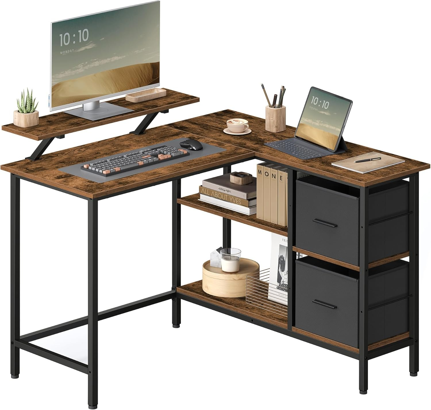 Birou de colt in forma L, cu 2 sertare si suport monitor, montare pe ambele parti, stil industrial, 115x105 cm, maro rustic