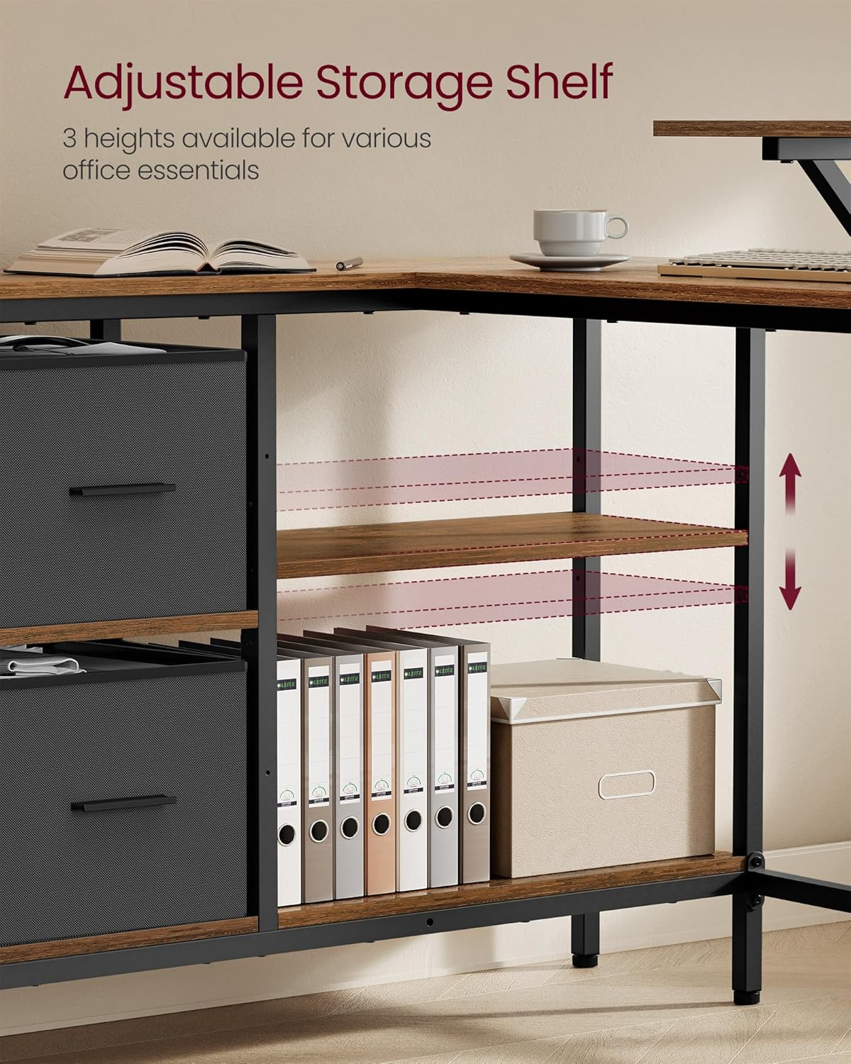 Biroul de colt VASAGLE in forma L este conceput pentru organizarea eficienta a spatiului de lucru. Blatul dublu ofera suprafata generoasa pentru calculator, monitor si accesorii, iar cele doua sertare permit depozitarea documentelor si a obiectelor de birou. Designul industrial cu finisaj maro vintage si cadru metalic se potriveste in birou, dormitor sau zona de gaming.