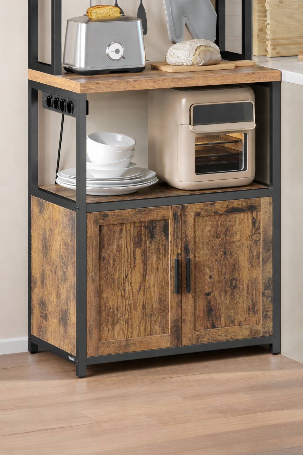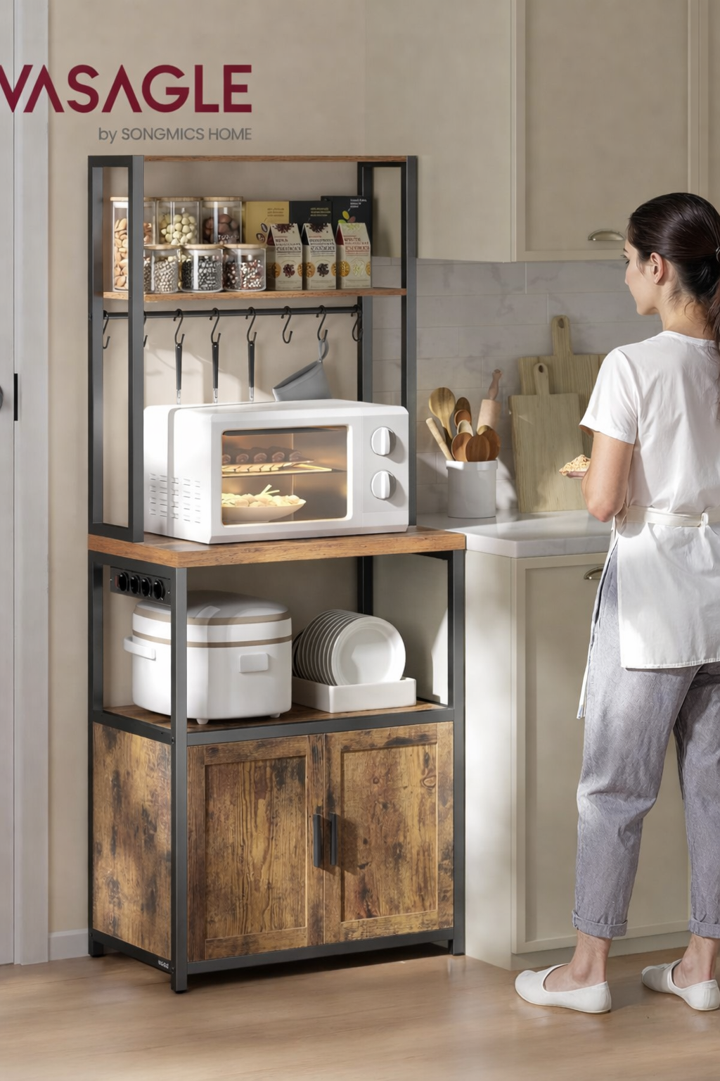 VASAGLE Raft bucatarie cu 4 prize, blat de lucru 90 cm, raft microunde, dulap si carlige, 40x60x170 cm, maro rustic