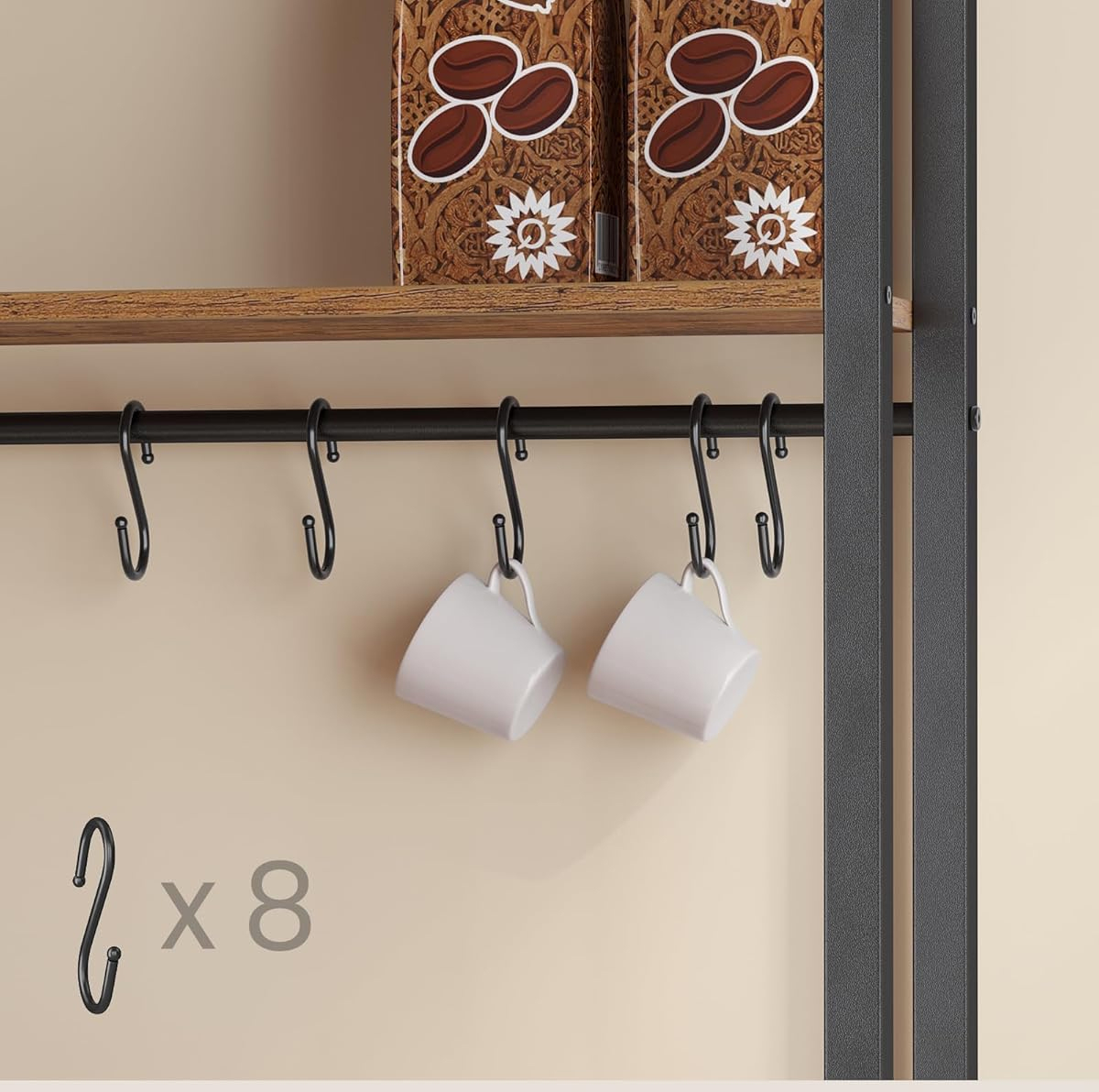 Etajera de bucatarie cu blat de lucru la 90 cm inaltime este conceputa pentru organizare eficienta si confort in utilizare. Blatul gros de 3 cm ofera stabilitate pentru aparate precum espressorul sau robotul de bucatarie, iar rafturile si carligele permit depozitarea ordonata a accesoriilor.
