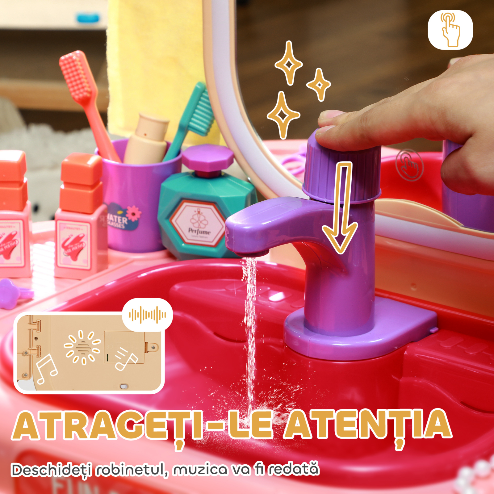 Ofera-le printeselor tale momente autentice de magie cu toaleta de infrumusetare [BRAND NAME] pentru fetite. Datorita unei oglinzi imbogatite cu lumini LED si unui robinet capabil sa furnizeze apa, aceasta toaleta este accesoriul ideal pentru orice viitoare printesa. Structura include, de asemenea, spatii dedicate pentru prosoape si dezinfectant, asigurand multa distractie in siguranta.
