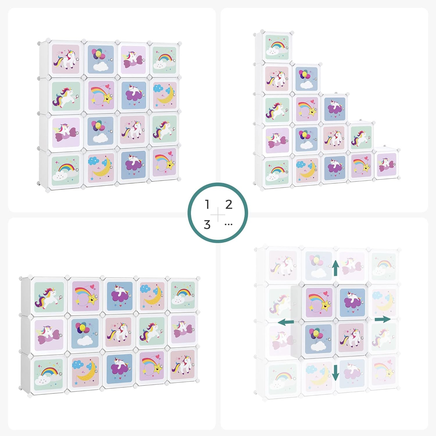 Detalii produs: Culoare: Alb Material: Panouri din plastic PP cu cadru metalic, conectori din plastic ABS Dimensiuni (15 cuburi): 153 x 31 x 153 cm (L x l x i) Dimensiuni (16 cuburi): 123 x 31 x 123 cm (L x l x i) Dimensiuni per cub: 30 x 30 x 30 cm (L x l x i) Greutate: 10,5 kg Capacitate maxima de incarcare statica per cub: 10 kg Despre acest articol Curcubee, unicorni, baloane, stele - acest raft cubic evoca o lume de basm in viata reala. In plus, imaginile frumoase ii fac pe copii sa le placa sa isi pastreze lucrurile pe acest raft. Cu panourile sale din plastic PP ingrosat, cadrul metalic solid si conectorii din plastic armat, acest raft fara suruburi poate sustine pana la 10 kg per cub. O protectie la inclinare inclusa asigura mai multa stabilitate.Dinozaurii de jucarie sunt prea mari pentru unul dintre cuburile de 30 x 30 x 30 cm? Nu va faceti griji, trebuie doar sa scoateti o placa. Astfel veti obtine un compartiment mai mare!Va oferim un ciocan de cauciuc si instructiuni usor de inteles - construirea unui raft nu a fost niciodata atat de usoara! In plus, panourile din plastic pot fi usor transportate si depozitate dupa demontarea raftului.
