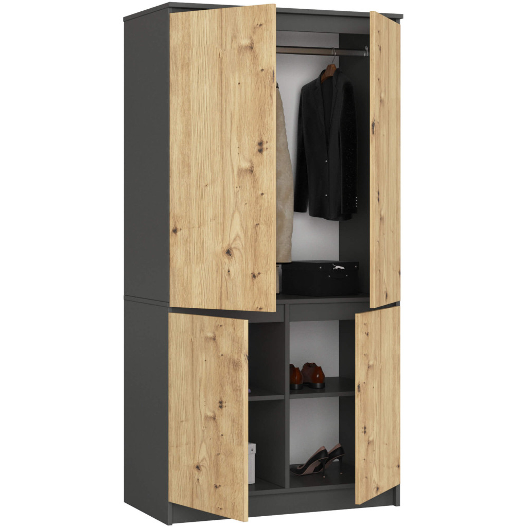 Dulapul S90 CLP cu 4 usi in combinatie gri grafit si stejar artisan este o piesa moderna si versatila pentru dormitor, hol sau living. Ofera spatiu generos de depozitare prin rafturile incapatoare si compartimentul cu bara pentru umerase. Fabricat din PAL laminat rezistent la uzura si finisat cu cant ABS, asigura durabilitate si stabilitate in utilizare zilnica.