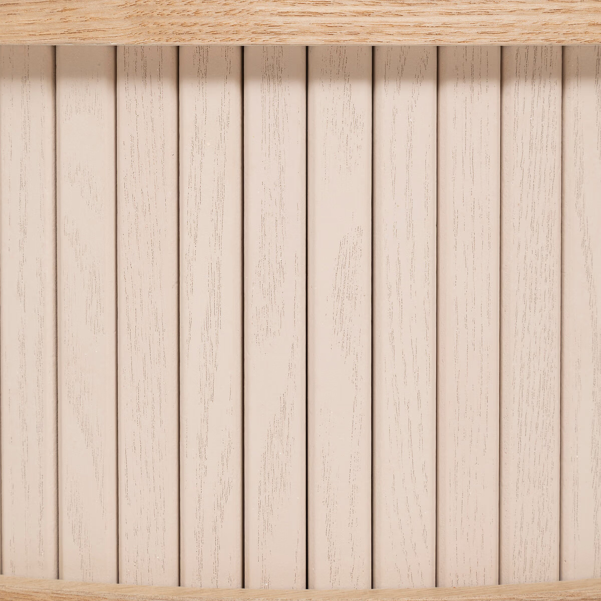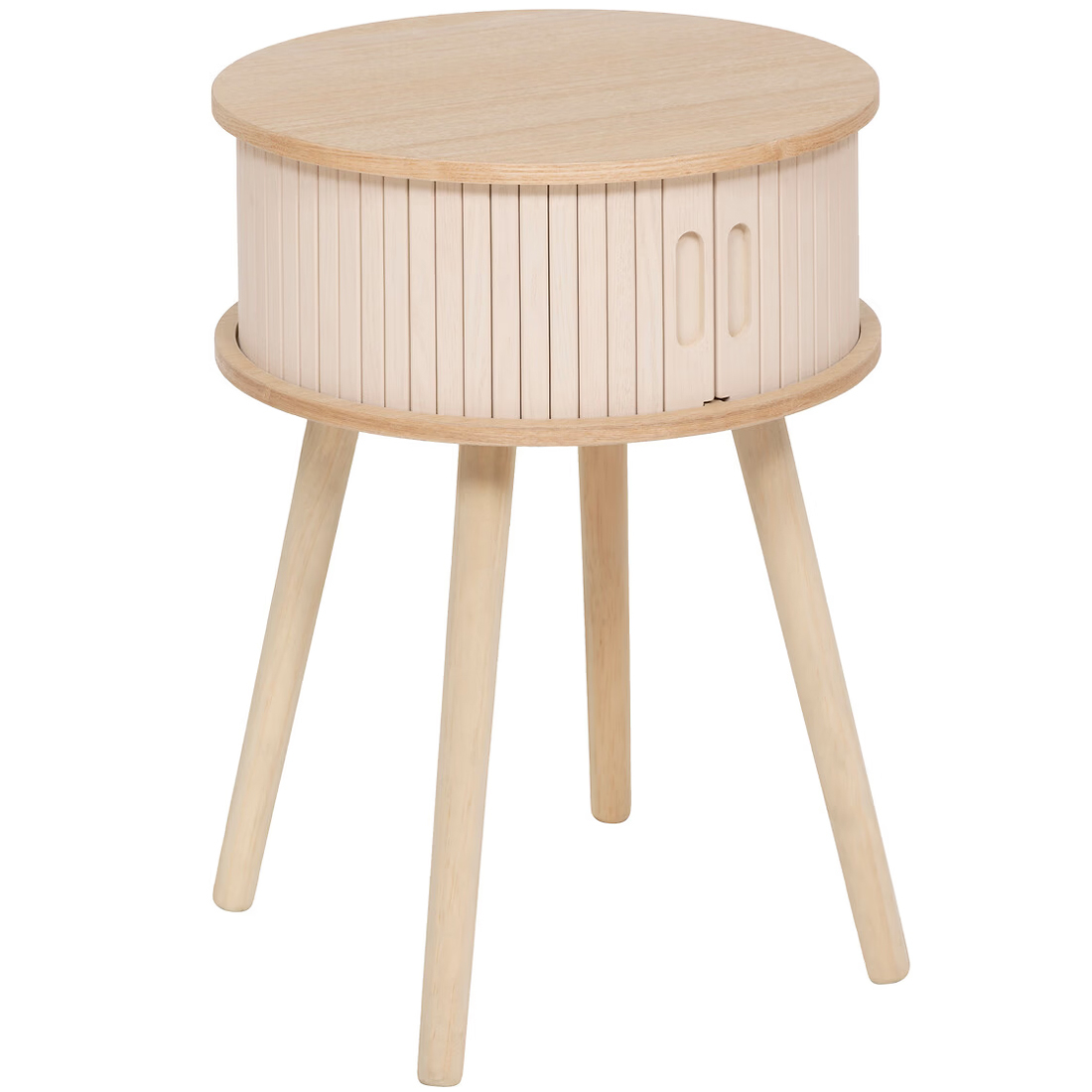 Specificatii tehnice    Brand:  Atmosphera  Model:  Nysos  Dimensiuni produs:  Lungime 40 cm x Latime 40 cm x Inaltime 54 cm  Greutate produs:  4.1 kg  Material:  MDF E1  Placaj:  Furnir frasin si pin  Finisaj:  Mat, vopsit cu acrilic  Culoare:  Crem (usi) si lemn natural (blat)  Numar usi:  2 usi glisante, efect de lamele  Compartiment interior:  1 raft ajustabil pe inaltime   Scurta descriere   Atmosphera Nysos este o noptiera rotunda eleganta, cu design modern si accente naturale. Echipata cu 2 usi glisante cu efect de lamele si un raft interior ajustabil, este ideala pentru a organiza discret obiectele personale. Picioarele tip compas si finisajul mat completeaza aspectul estetic si cald.   Caracteristici principale    	 Design rotund cu accente scandinave  	 2 usi glisante cu efect decorativ  	 1 raft interior ajustabil  	 Blat cu finisaj lemn natural  	 Finisaj crem mat si structura eleganta  	 Dimensiuni: 40 x 40 x 54 cm