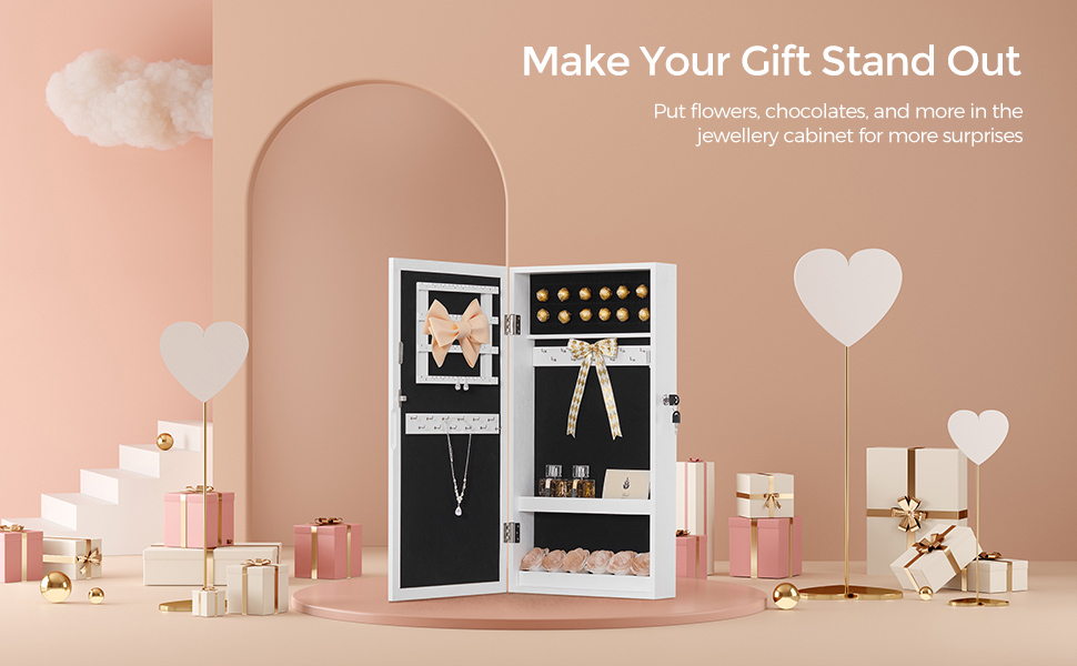 Parametrii: Dimensiuni: 37 x 10,5 x 67 cm (L x P x H) Dimensiunea oglinzii: 29 x 59 cm (D x H) Material: MDF de mediu, catifea, oglinda Culoare: alb Greutate unica: 5,4 kg Despre acest articol Deoarece bijuteriile dvs. va reflecta gusturile, pastrati-le in stare buna in acest dulap de bijuterii uimitor, care aduce o nota de farmec cu finisajul sau alb.Cu o dimensiune de 10 x 37 x 67 cm, acest dulap ofera mult spatiu de depozitare cu 2 compartimente, 65 de fante pentru inele, 64 de fante pentru cercei, 24 de gauri pentru unghii si 24 de carlige pentru coliere.Cu incuietoare si usa magnetica pentru a va pastra obiectele de valoare in siguranta si in ordine fara sa va faceti griji pentru ele.Dulapul vine preasamblat, pur si simplu fixati-l pe perete cu cele 2 suruburi de ancorare si ati terminat!