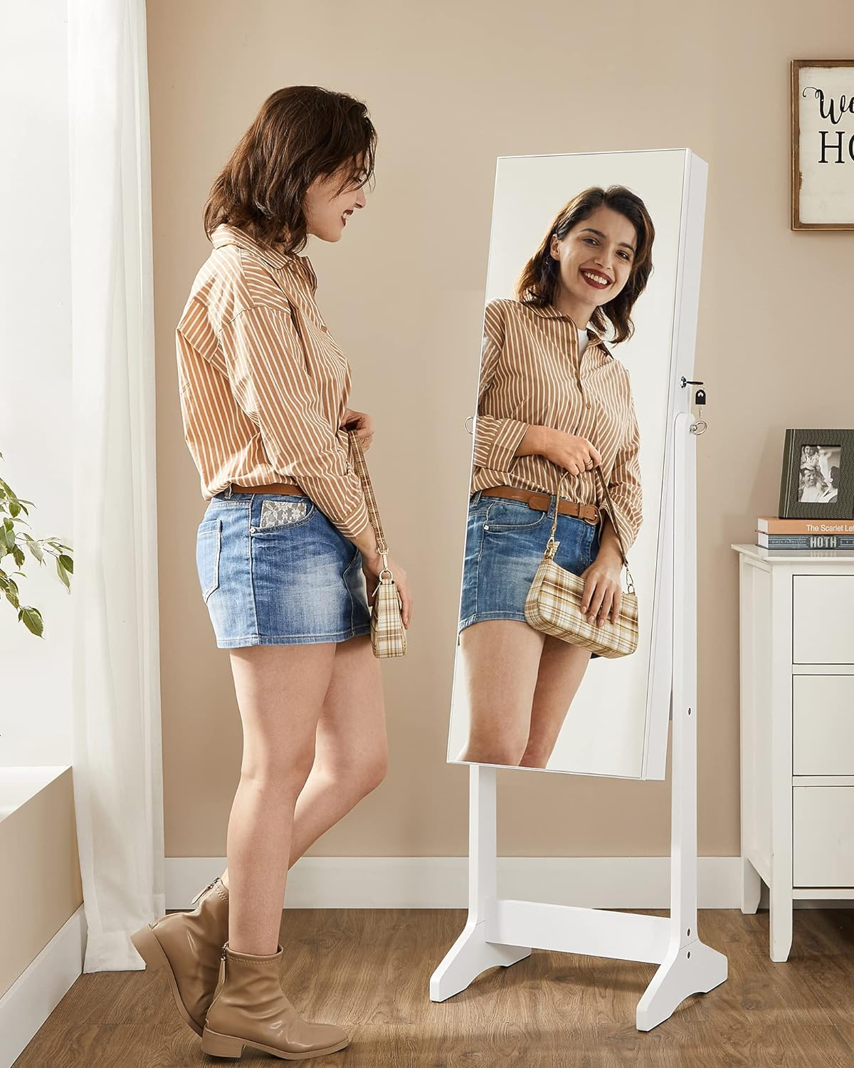 Detalii despre produs: Culoare: Alb Material: MDF (panou din fibre de densitate medie). Dimensiuni totale: 41,2 x 36,5 x 152 cm (L x l x i). Dimensiunea corpului dulapului: 37,5 x 9,7 x 108 cm (L x l x i). Greutate: 11,4 kg. Continutul cutiei : 1 x dulap pentru bijuterii, 2 x chei, 1 x pachet de accesorii, 1 x protectie impotriva inclinarii, 1 x manual de instructiuni. Despre acest articol O multime de spatiu pentru bijuterii: 108 suporturi si 36 de gauri pentru cercei, 36 de carlige pentru lanturi, 39 de fante pentru inele, o bara pentru bratari, 4 rafturi, inclusiv un raft inalt pentru cosmetice mari.In interiorul dulapului se afla doua organizatoare de cosmetice din plastic usor de intretinut, care sunt dotate cu 3 compartimente adanci pentru pensule, 2 compartimente suplimentare pentru pudra si 8 suporturi pentru rujuri.Admirati-va din cap pana in picioare in oglinda integrala fara rama a acestui dulap pentru bijuterii.Corpul acestui dulap pentru bijuterii vine preasamblat. Tot ce trebuie sa faceti este sa atasati cele doua picioare si apoi sa umpleti dulapul cu bijuteriile dumneavoastra. Un cadou excelent pentru: Ziua de nastere a iubitei tale, Ziua Mamei sau Craciunul. Acest dulap de bijuterii de inalta calitate, fabricat din MDF solid, asigura un aspect stralucitor.