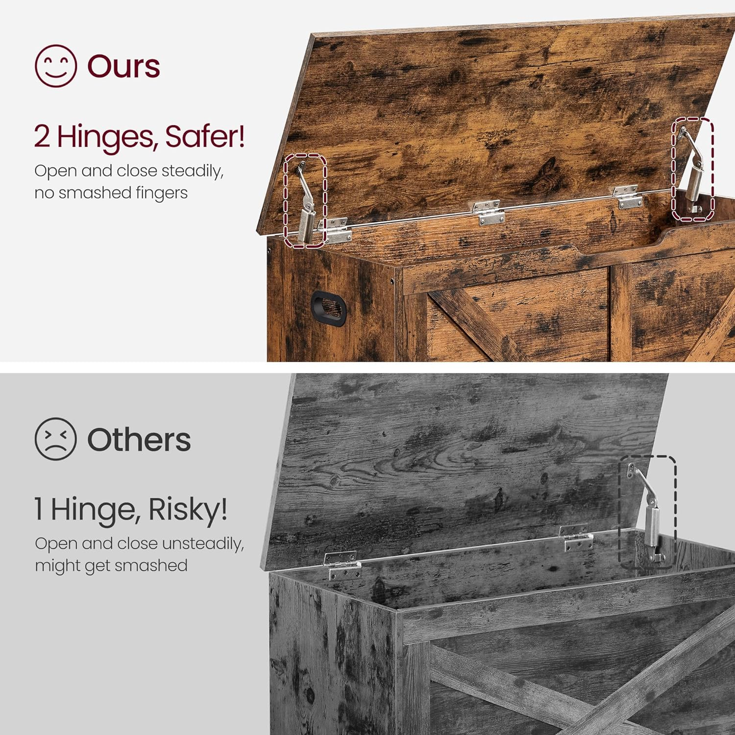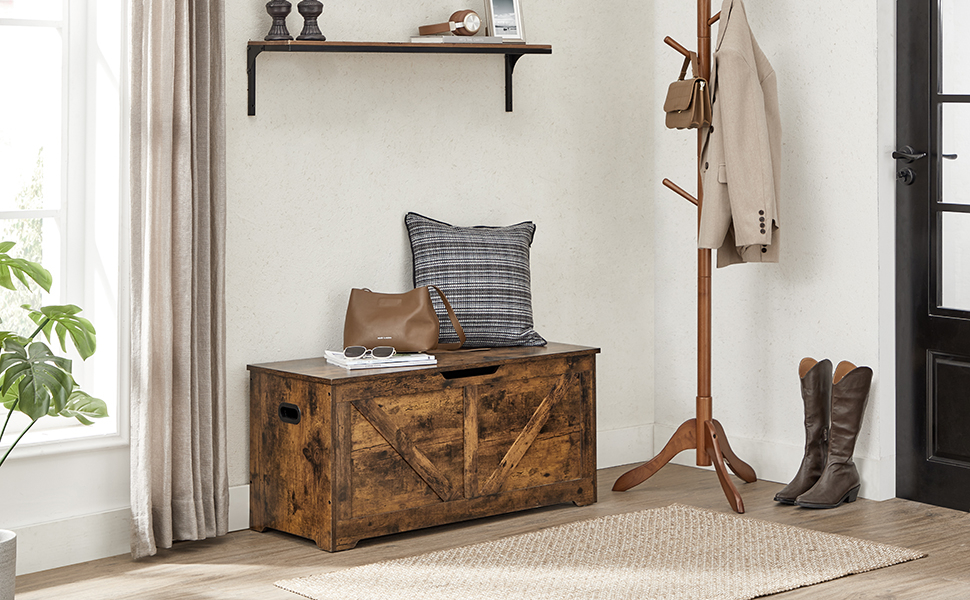 Specificatii:   	 Culoare: Maro Rustic  	 Material: PAL  	 Dimensiune produs: 100 x 40 x 46 cm (L x l x H)  	 Greutate produs: 19,5 kg  	 Max. Capacitate de incarcare statica: 100 kg    Descriere produs  C ombinand PAL rustic si designul usii in stil hambar, aceasta banca de depozitare atragatoare aduce o atmosfera calda de ferma casei tale, transformandu-ti casa intr-un loc mai confortabil si primitor.Depozitare, cu cat este mai mare, cu atat mai bine! Deschideti acest cufar si veti gasi un compartiment spatios de 100 x 40 x 46 cm pentru jucarii, haine sau paturi pentru copii. In plus, „blatul” mare este perfect pentru a va expune piesele decorative. Manere practice si balamale de siguranta:  Cu cele 2 manere, puteti muta cu usurinta acest cufar de jucarii pe hol, camera de joaca sau camera de zi. Dar cele 2 balamale? Iti protejeaza degetele impotriva eventualelor raniri.   Stai jos pentru a-ti schimba pantofii:  Cadrul din PAL al acestei banci de pantofi poate suporta pana la 100 kg, facandu-l puternic si durabil. Puteti lua loc si va puteti schimba pantofii cu incredere. Ce primesti:  un cufar de depozitare rustic, cu mult spatiu de depozitare, instructiuni clare si piese numerotate pentru o calatorie de asamblare placuta si fara efort.