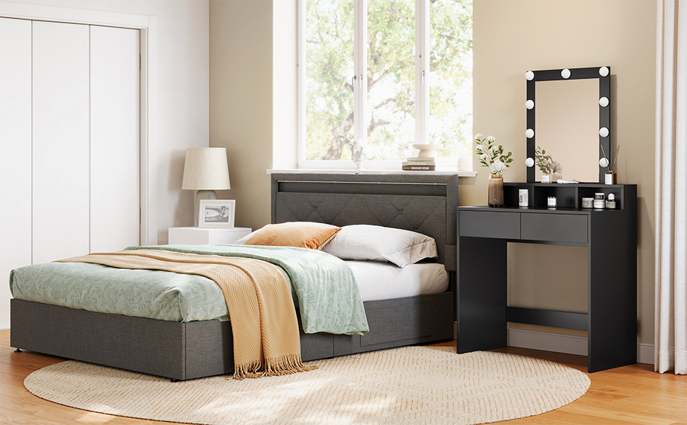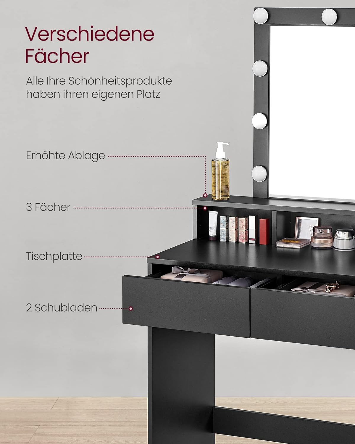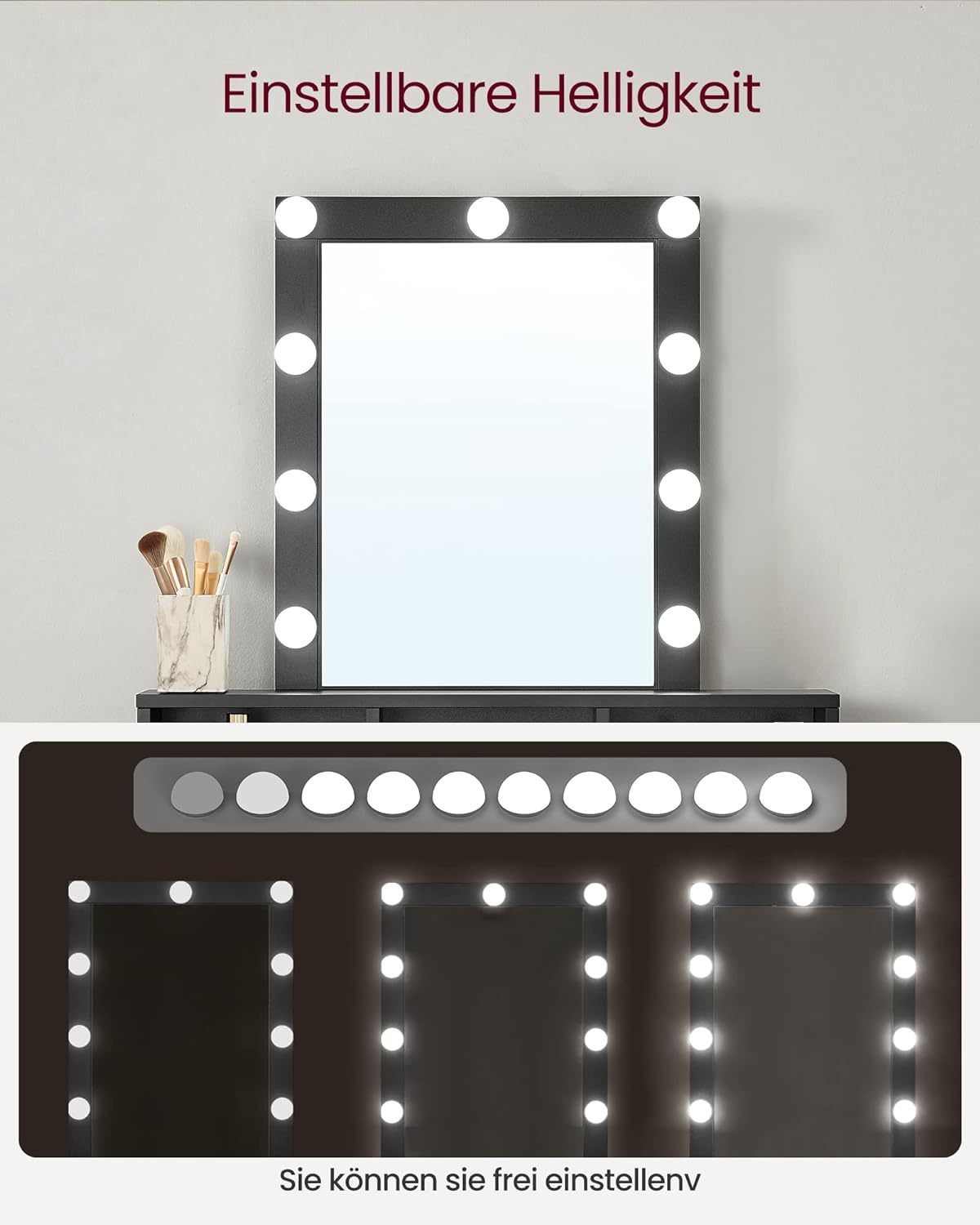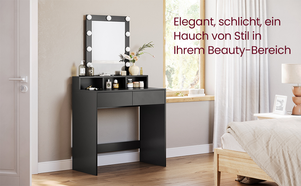 Culoare Negru  	 Dimensiunile produsului 80 x 40 x 145 cm; 23,5 kilograme  	 Caracteristici speciale lumina reglabila  	 Greutatea articolului 23,5 kilograme    Despre acest articol  Luminozitate reglabila:  9 becuri (apasati lung comutatorul pentru a regla luminile) indeplinesc diferite cerinte de luminozitate pentru un machiaj perfect.1 raft inaltat pentru parfumuri, 3 compartimente deschise pentru rujuri, 2 sertare spatioase pentru uscatoare de par si placa de indreptat parul si un raft mare. Aceasta masa de toaleta ofera mult spatiu pentru a va pastra toate articolele bine depozitate. Cablu bec ascuns:  Cablurile becului sunt ascunse in spatele oglinzii si nu sunt vizibile la suprafata pentru a crea un mediu mai frumos. Protectie impotriva inclinarii pentru mai multa siguranta:  Atasati masa cosmetica pe perete cu protectia impotriva inclinarii inclusa pentru a obtine siguranta maxima. Solida si usor de curatat:  aceasta masa de toaleta din PAL de calitate este solida si durabila; suprafata sa este rezistenta la uzura si usor de curatat, ceea ce permite o utilizare indelungata.
