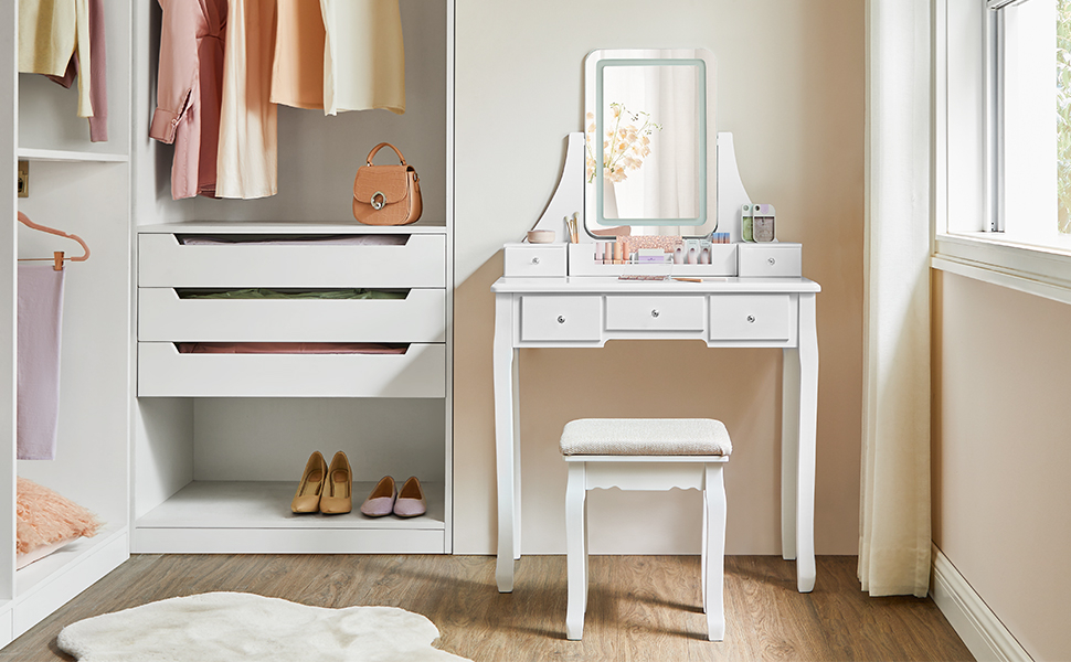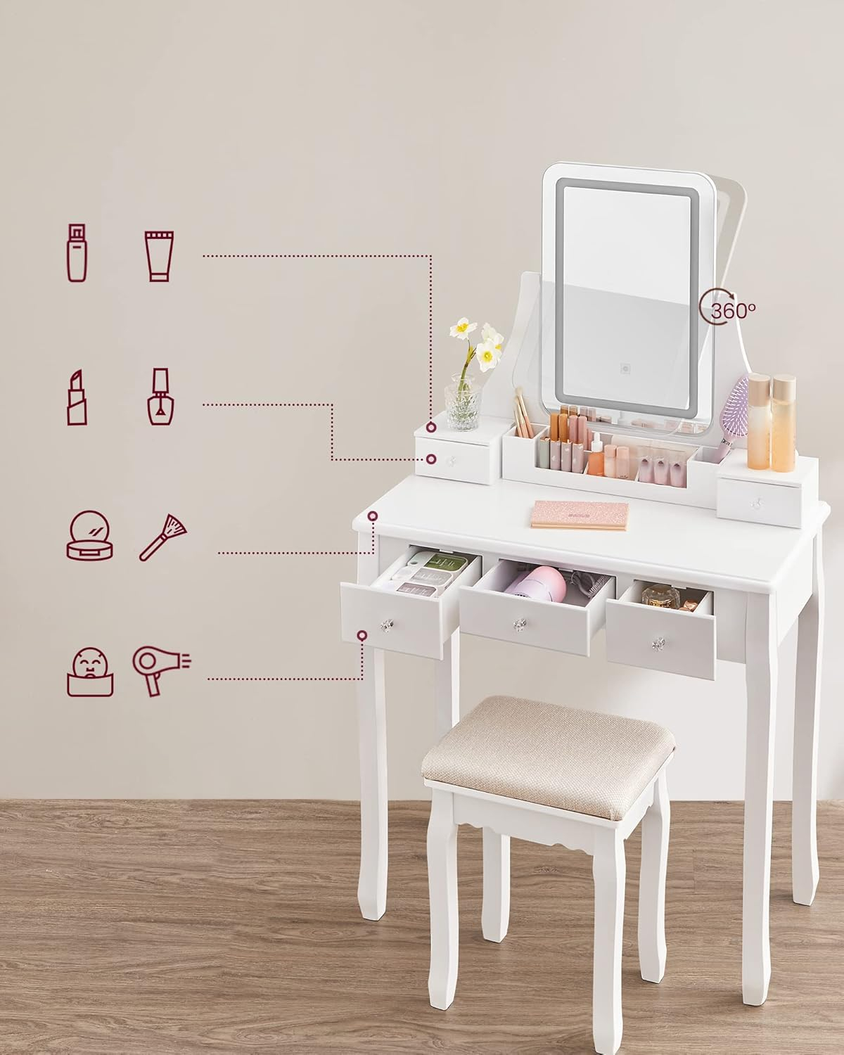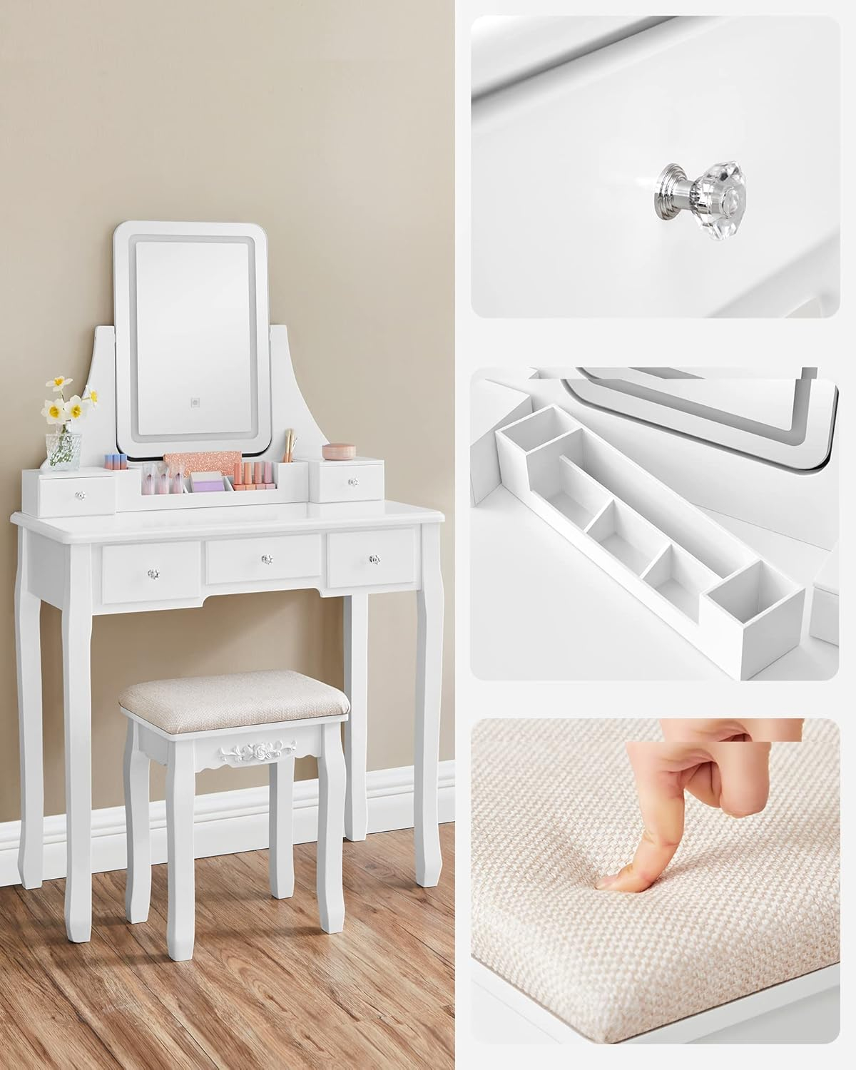 Detalii produs:   	 Culoare: Alb.  	 Material: lemn (MDF), picioare masa din pin, picioare taburet din lemn de cauciuc, spuma, husa din amestec de bumbac si in.  	 Masuta de toaleta: 80 x 40 x 137,5 cm (L x l x i).  	 Dimensiuni taburet: 37 x 28 x 45 cm (L x l x i).  	 Capacitatea de incarcare statica a scaunului: 130 kg.   Note:   	 Copiii nu trebuie sa se catere sau sa se joace cu el din motive de siguranta.  	 Va rugam sa asamblati produsul exact conform instructiunilor.  	 Pastrati produsul departe de apa.  	 Va rugam sa atasati produsul la perete cu accesoriul anti-inclinare inclus.       Despre acest articol  Iluminare LED cu 3 culori si intensitate reglabila:  Apasati scurt pentru a schimba culorile, apasati lung pentru a regla intensitatea, astfel incat sa puteti gasi lumina potrivita si sa obtineti un machiaj perfect. Oglinda transparenta si rotativa:  Oglinda transparenta de machiaj se roteste la 360° si va permite sa va vedeti machiajul din unghiuri diferite. Spatiu suficient:  Aceasta masuta de toaleta are 5 sertare, un organizator detasabil cu 6 compartimente deschise de diferite dimensiuni pentru a va pastra toate produsele bine depozitate. Sigur, stabil si confortabil:  Protectia la inclinare ataseaza masuta de toaleta la perete pentru un mediu sigur; picioarele mesei din pin si picioarele taburetului din lemn de cauciuc sunt robuste si stabile; puteti sta confortabil pe taburetul captusit. Asamblare usoara:  Aceasta masa de toaleta este preasamblata, trebuie doar sa atasati picioarele mesei, picioarele taburetului si oglinda. Piesele marcate si instructiunile ilustrate simplifica, de asemenea, asamblarea.