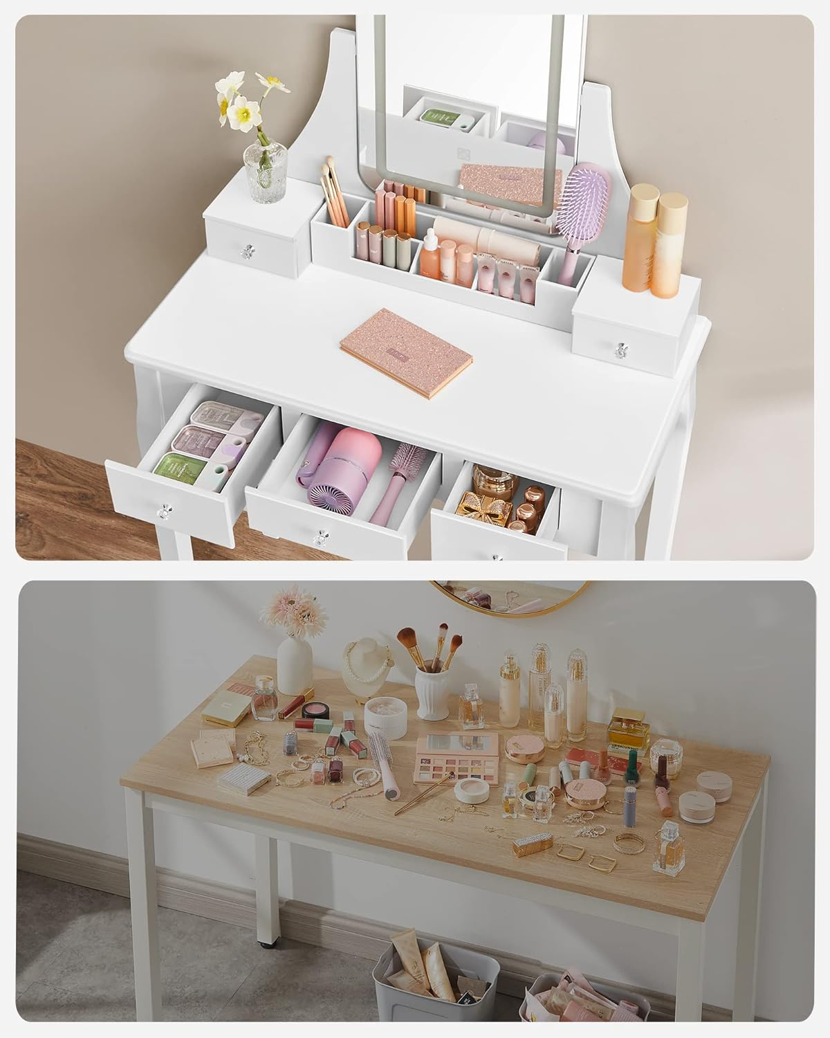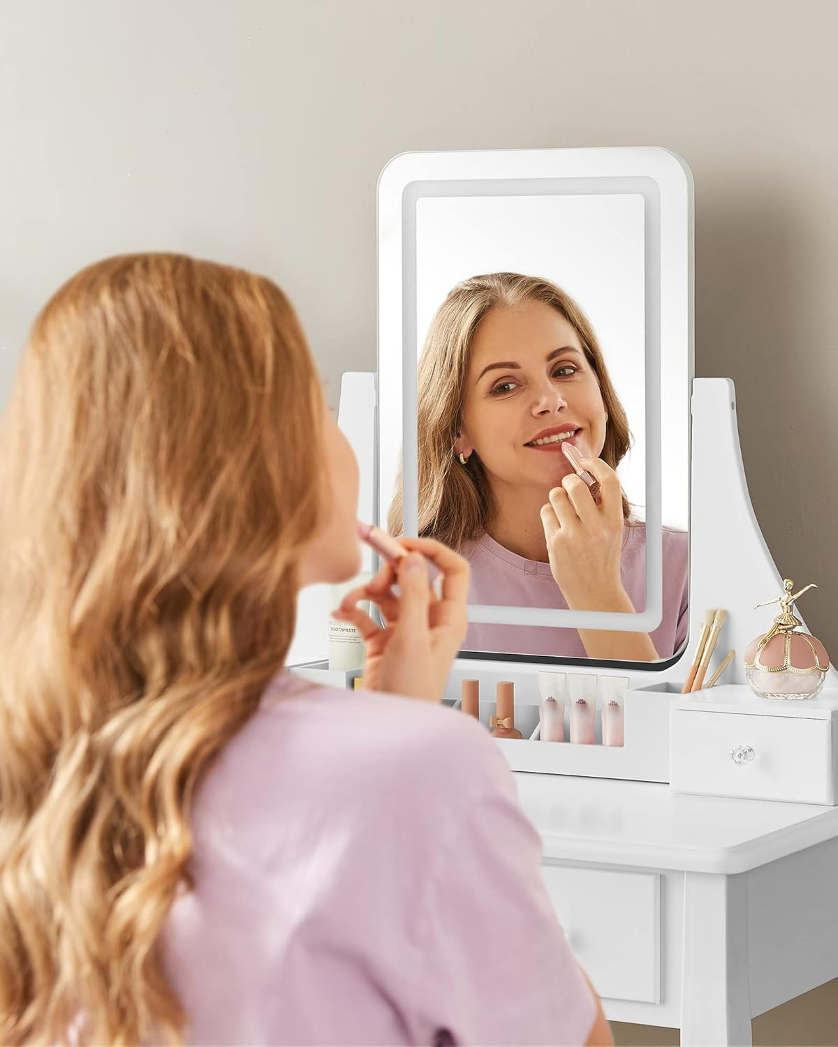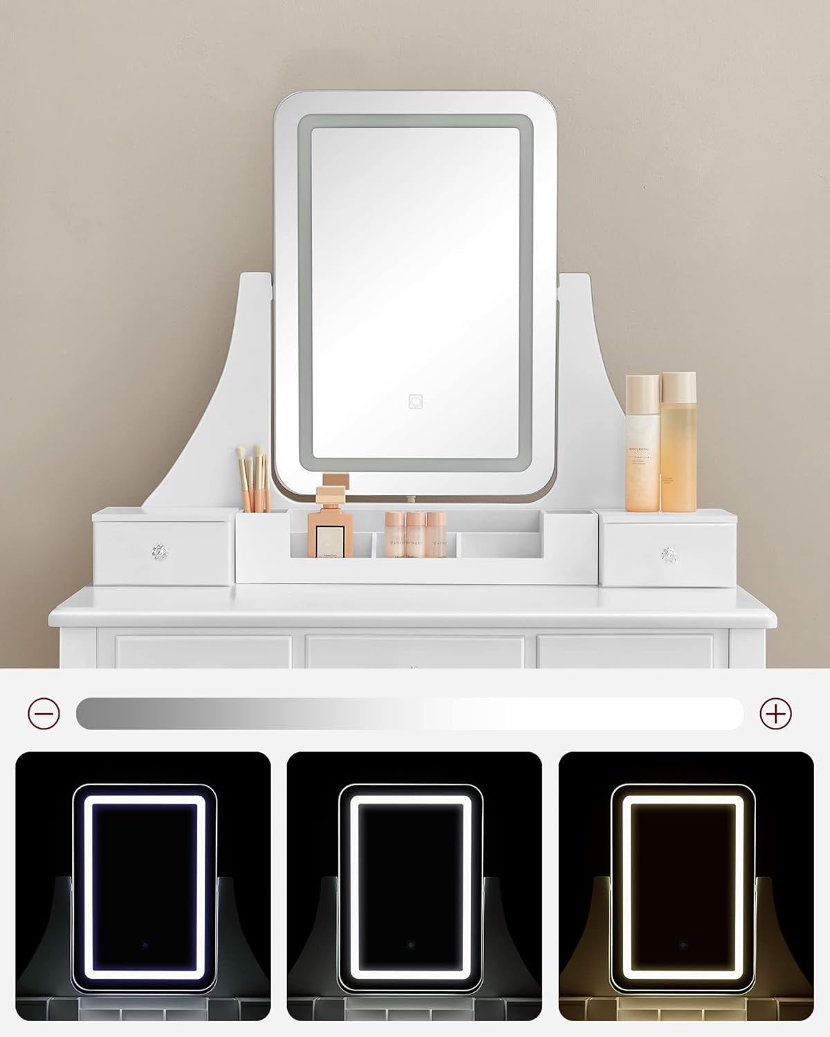 Detalii produs:   	 Culoare: Alb.  	 Material: lemn (MDF), picioare masa din pin, picioare taburet din lemn de cauciuc, spuma, husa din amestec de bumbac si in.  	 Masuta de toaleta: 80 x 40 x 137,5 cm (L x l x i).  	 Dimensiuni taburet: 37 x 28 x 45 cm (L x l x i).  	 Capacitatea de incarcare statica a scaunului: 130 kg.   Note:   	 Copiii nu trebuie sa se catere sau sa se joace cu el din motive de siguranta.  	 Va rugam sa asamblati produsul exact conform instructiunilor.  	 Pastrati produsul departe de apa.  	 Va rugam sa atasati produsul la perete cu accesoriul anti-inclinare inclus.       Despre acest articol  Iluminare LED cu 3 culori si intensitate reglabila:  Apasati scurt pentru a schimba culorile, apasati lung pentru a regla intensitatea, astfel incat sa puteti gasi lumina potrivita si sa obtineti un machiaj perfect. Oglinda transparenta si rotativa:  Oglinda transparenta de machiaj se roteste la 360° si va permite sa va vedeti machiajul din unghiuri diferite. Spatiu suficient:  Aceasta masuta de toaleta are 5 sertare, un organizator detasabil cu 6 compartimente deschise de diferite dimensiuni pentru a va pastra toate produsele bine depozitate. Sigur, stabil si confortabil:  Protectia la inclinare ataseaza masuta de toaleta la perete pentru un mediu sigur; picioarele mesei din pin si picioarele taburetului din lemn de cauciuc sunt robuste si stabile; puteti sta confortabil pe taburetul captusit. Asamblare usoara:  Aceasta masa de toaleta este preasamblata, trebuie doar sa atasati picioarele mesei, picioarele taburetului si oglinda. Piesele marcate si instructiunile ilustrate simplifica, de asemenea, asamblarea.