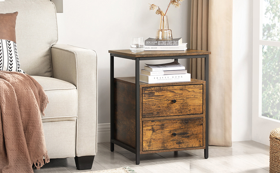 Specificatii: Culoare: Maro rustic, negru Material: Placi aglomerate, otel Dimensiunea produsului: 45 x 45 x 45 x 60 cm (L x l x a) Greutatea produsului: 16 kg Max. Capacitate de incarcare statica totala: 40 kg Despre acest articol Aceasta noptiera rustica maro si neagra aduce o vibratie de stil industrial in dormitorul dvs.Compartimentul superior si cel deschis pot gazdui o lampa, un pahar si telefonul dvs. Cele 2 sertare sunt perfecte pentru a tine cartile si lucrurile la indemana.Placile aglomerate de inalta calitate si barele de otel rezistente asigura o structura stabila. Picioarele reglabile asigura o stabilitate excelenta chiar si pe un teren usor denivelat.Datorita mecanismelor sale silentioase, puteti deschide sertarele fara sa va treziti partenerul de viata pe timp de noapte. In partea de jos, un spatiu intre baza masutei si podea faciliteaza curatarea.Cu o structura simpla, piese numerotate si instructiuni ilustrate, asamblarea este usoara.