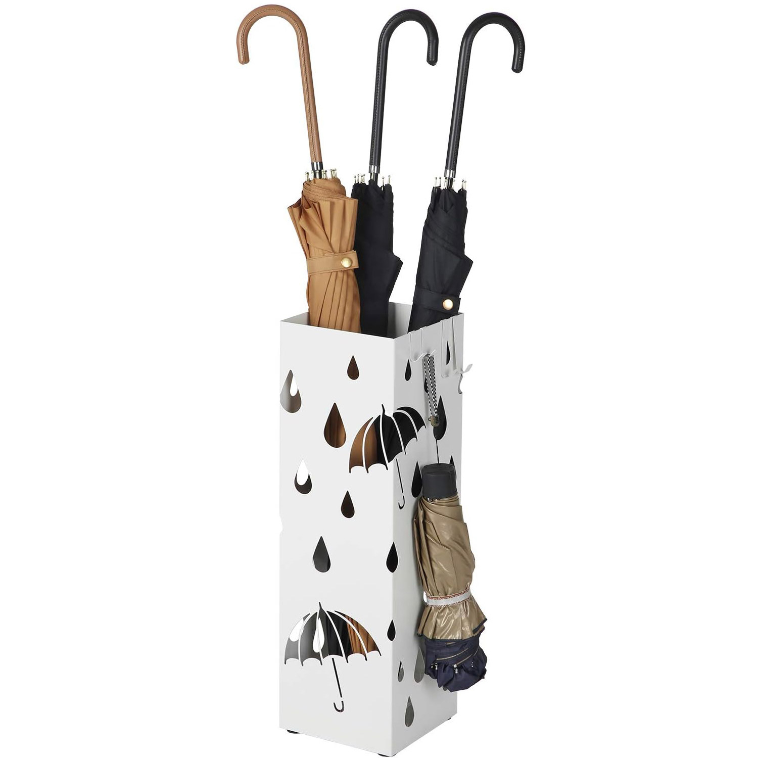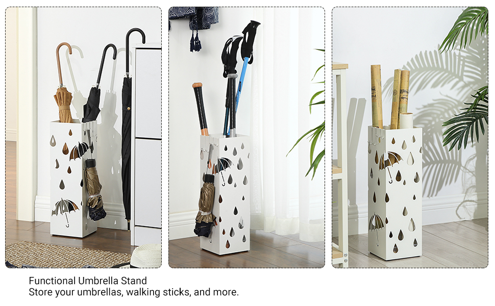 Acest suport de 15,5 x 15,5 x 49 cm ofera suficient spatiu pentru umbrelele dvs. lungi. Dar asta este doar o parte din el! Cele 4 carlige incluse (2 lungi si 2 scurte) va permit, de asemenea, sa agatati umbrelele dvs. mici pliabile, astfel incat sa nu se adune in partea de jos.