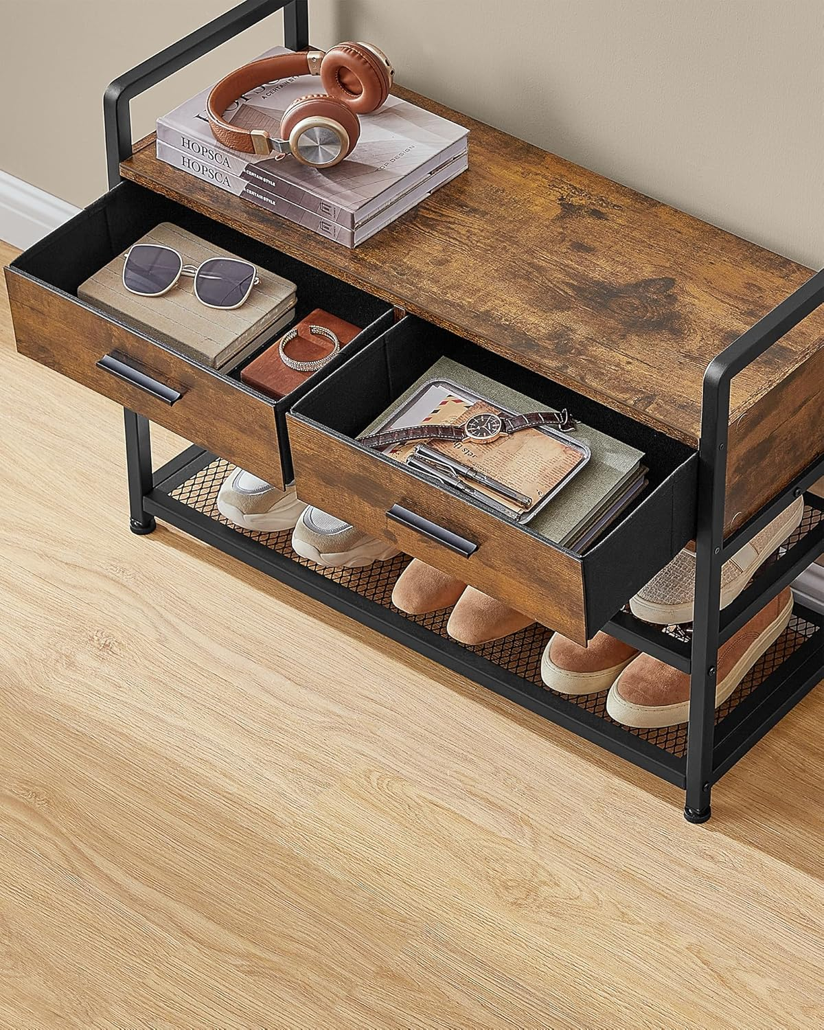 Design 6 in 1: Suportul pentru haine combina 10 carlige pentru haine, 2 sertare, o bara pentru haine, o banca, un suport pentru pantofi si un raft pentru a va optimiza spatiul si a va ajuta sa creati o intrare ordonata si functionala.