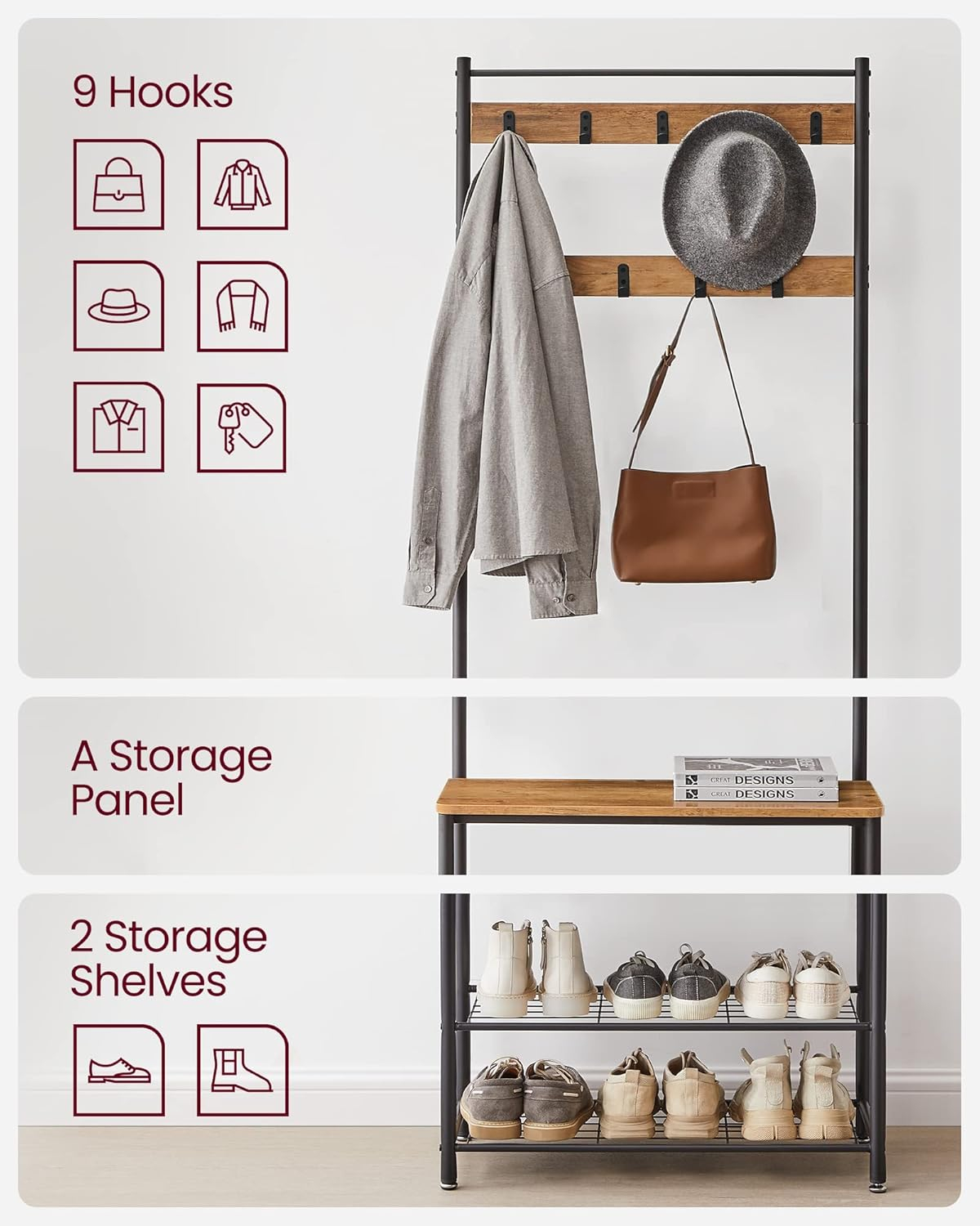 Cuierul VASAGLE 3 in 1 imbina carligele pentru haine, banca pentru incaltare si rafturile pentru pantofi intr-o singura piesa practica. Designul industrial in combinatie maro nuc si negru adauga caracter holului, iar structura metalica asigura stabilitate si rezistenta in utilizare zilnica.