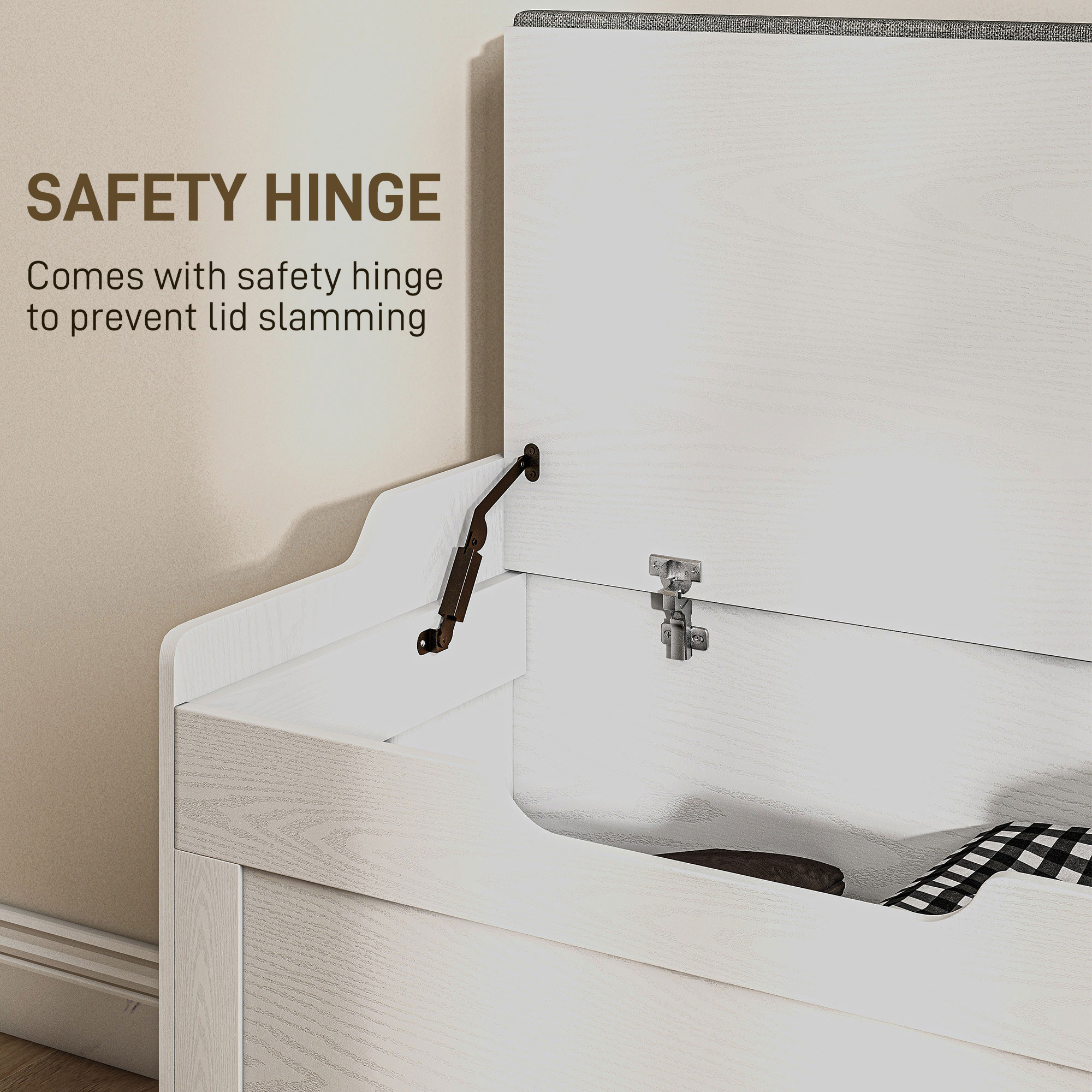 Banca de depozitare [BRAND NAME] este imbinarea perfecta intre stil si functionalitate! Cu o capacitate generoasa de 103L, aceasta lada de lemn este dotata cu o balama de siguranta pentru a preveni inchiderea brusca a capacului si pentru a proteja degetele. O poti folosi ca banca de depozitare sau banca de hol pentru incaltaminte, datorita pernei detasabile din material textil cu aspect de in care face sederea confortabila. Cu finisaje elegante in alb si perna gri, va imbogati stilul oricarei incaperi.