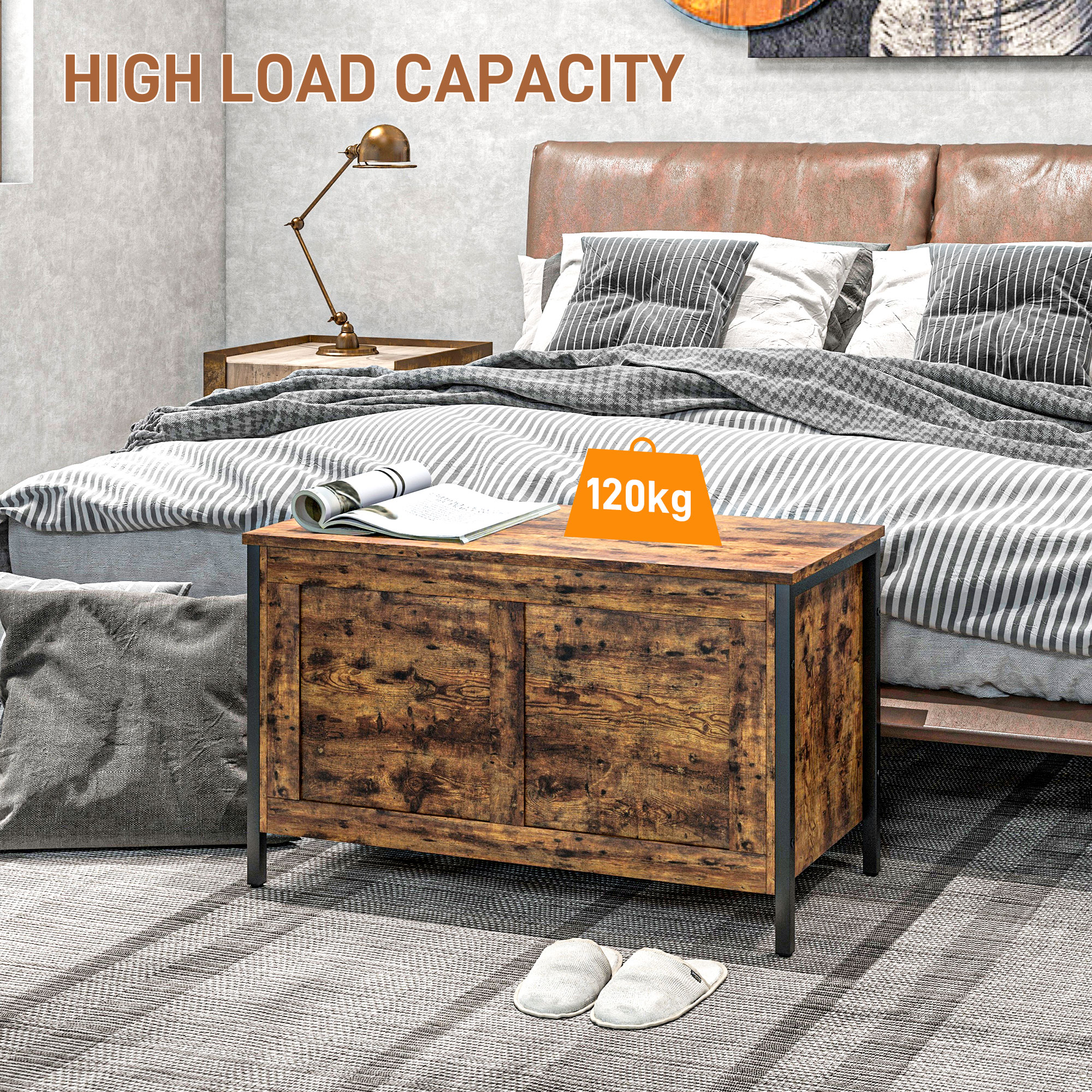 Descoperiti versatilitatea bancii de depozitare [BRAND NAME]: cu o capacitate de 95L, este perfecta pentru a depozita paturi sau jucarii. Capacul cu balamale de siguranta suporta pana la 100 kg si se transforma intr-o banca practica de depozitare. Cu un design de stil industrial, finisaje cu aspect de lemn si picioare negre, aceasta lada imbogateste elegant orice incapere.