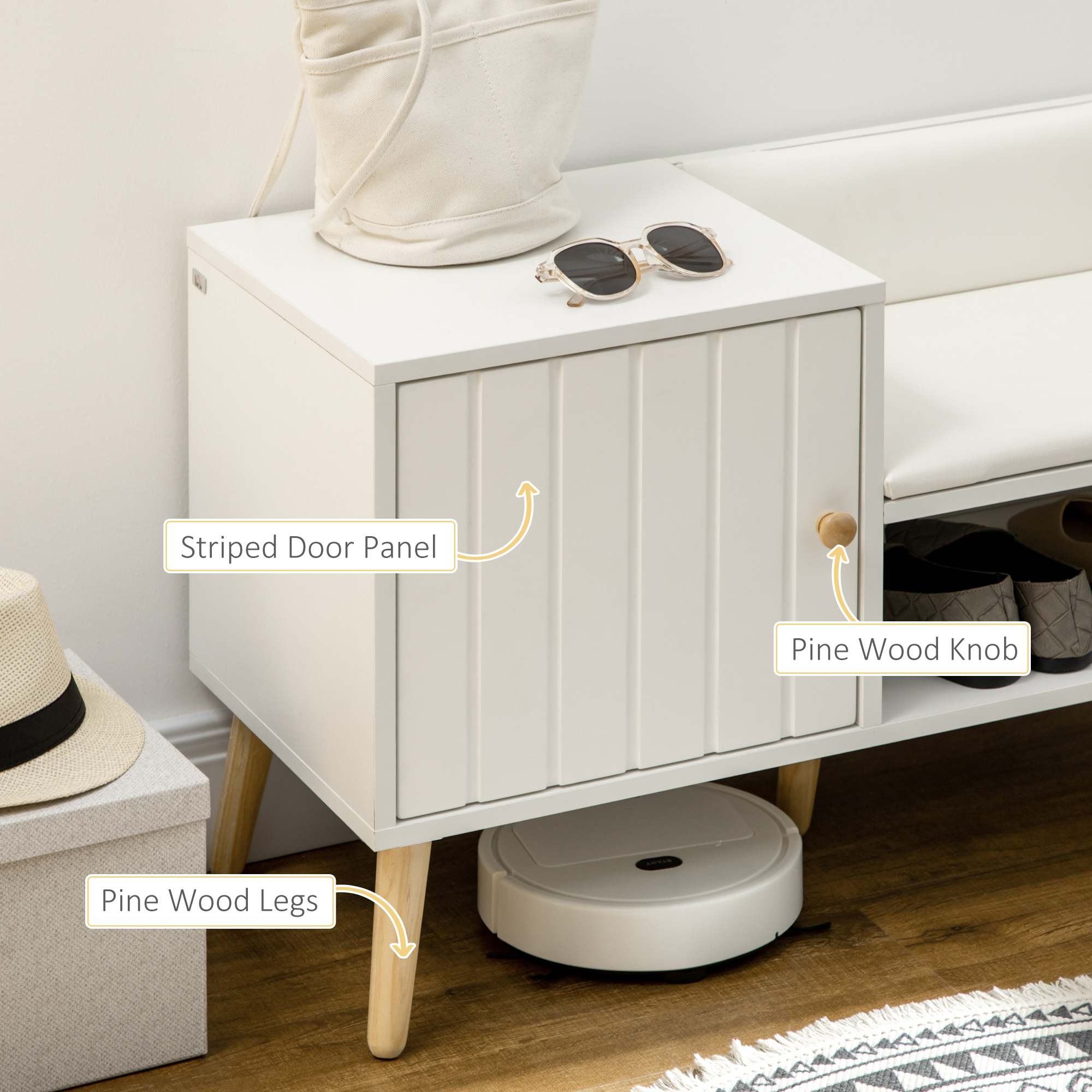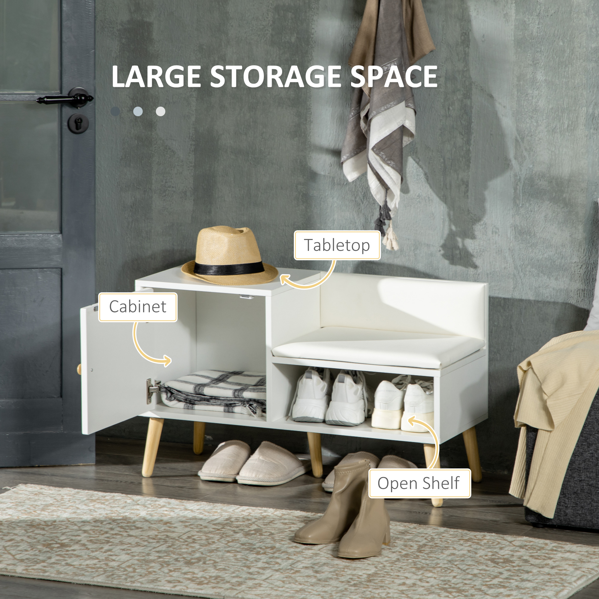 • DESIGN COMPAC CU SEDERE CaPTUsITa: Banca cu sezut moale si spatii de depozitare deschise sub capac, plus un dulapior lateral pentru obiecte mici. Ideala pentru holuri restranse.