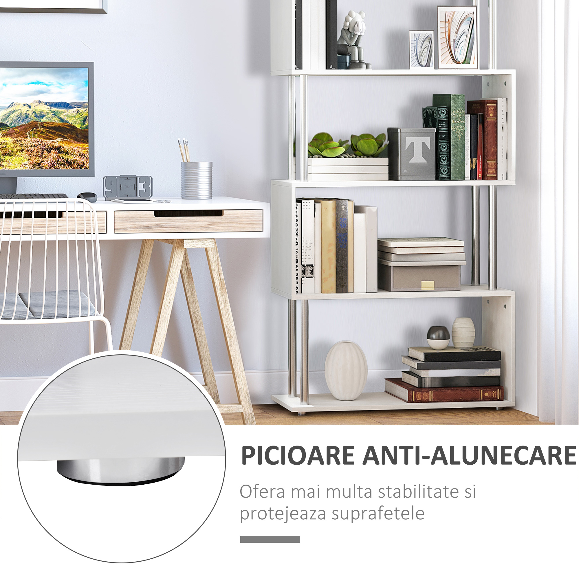 [BRAND NAME] biblioteca moderna, 4 rafturi, 80x30x145cm alb este piesa de mobilier care va incanta privirile. Este practica si eleganta, desi cu un design simplu si modern. Include acele 4 rafturi, un joc de imbinare intre PAL alb si tevi din fier. Se aseaza pe podea, are insa picioare mici de sustinere pentru ca pardoseala sa nu se zgarie. [BRAND NAME] biblioteca moderna, 4 rafturi, 80x30x145cm alb are o intrebuintare versatila. Este o biblioteca perfecta pentru orice incapere, fie dormitor, living sau birou. Pe rafturile acestei piese de mobilier veti avea suficient loc pentru toate lucrurile. Fie ca vorbim de multe carti, reviste, fie ca sunt si obiecte de decor pe care va doriti sa le expuneti, aceasta biblioteca va este utila. Pe termen lung sa o intretineti si sa o curatati este atat de usor. Are o suprafata lucioasa, fina, pe care veti trece usor cu carpa. Rezista la zgarieturi. in plus, gratie finisajului lucios a barelor din fier, se face distincta intre toate celelalte piese de mobilier.