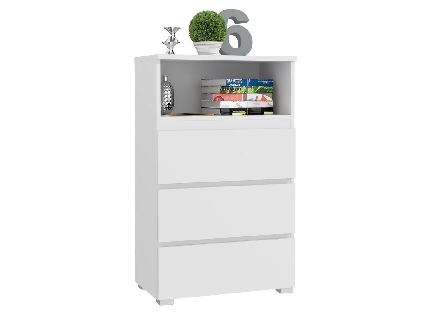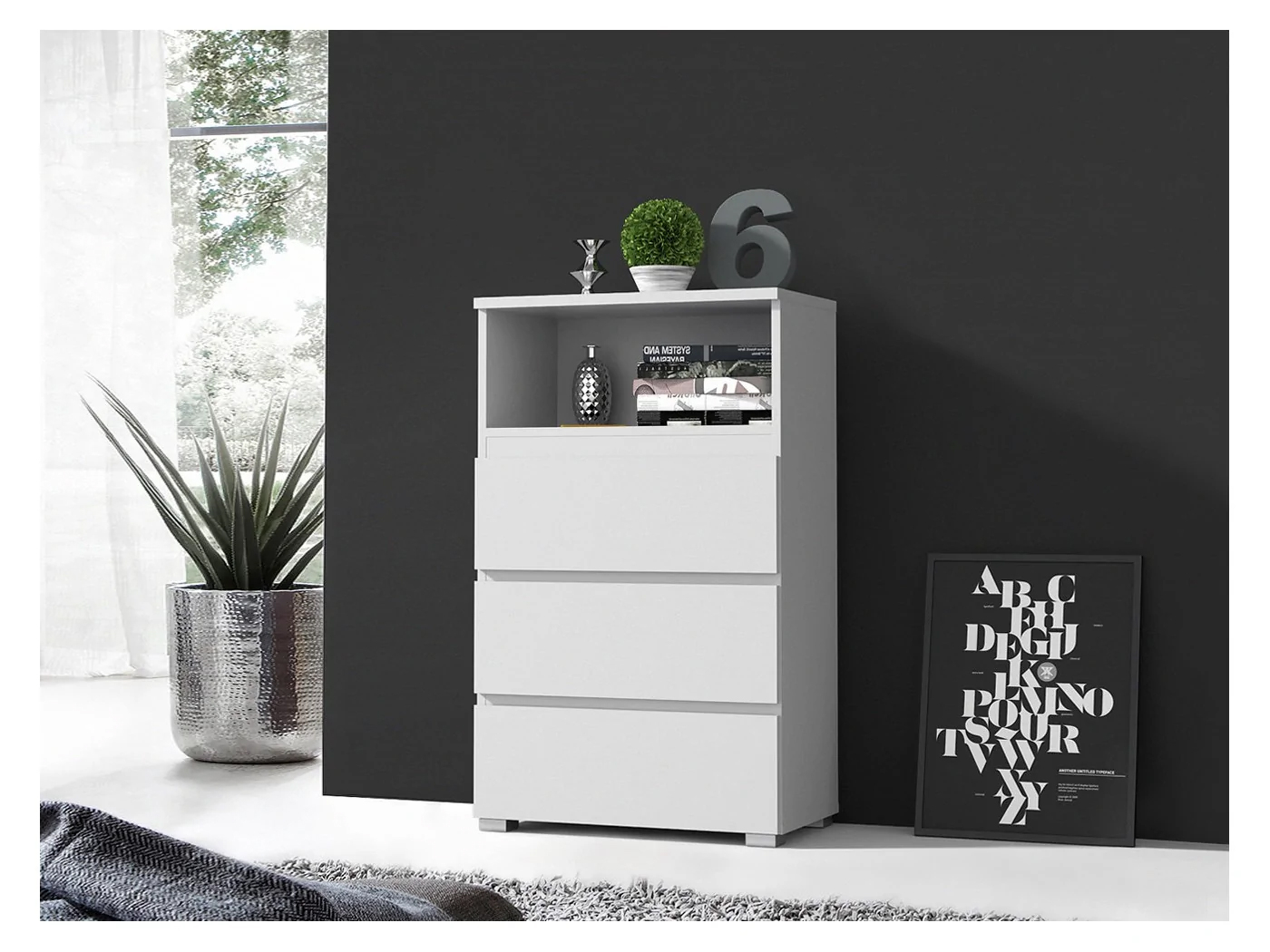 Specificatii tehnice    Material:  PAL melaminat, 18 mm  Culoare:  Alb, stejar sonoma, antracit/stejar craft  Dimensiuni:  65x37x106 cm  Greutate:  30 kg  Numar sertare:  3  Numar rafturi:  1  Structura suprafetei:  Mat   Scurta descriere   Comoda-regal Neo 03 imbina functionalitatea unui dulap cu sertare cu cea a unei etajere compacte. Prevazuta cu 3 sertare si un raft deschis, piesa ofera atat spatiu pentru depozitare, cat si loc pentru obiecte decorative sau carti. Este o alegere practica si versatila pentru camera unui adolescent, birou sau living.   Caracteristici principale    	 Design hibrid: comoda cu raft integrat  	 Trei sertare incapatoare  	 Raft deschis pentru decor sau carti  	 Finisaj mat rezistent la uzura  	 Potrivit in camere de adolescenti sau spatii moderne  	 Parte din colectia modulara NEO