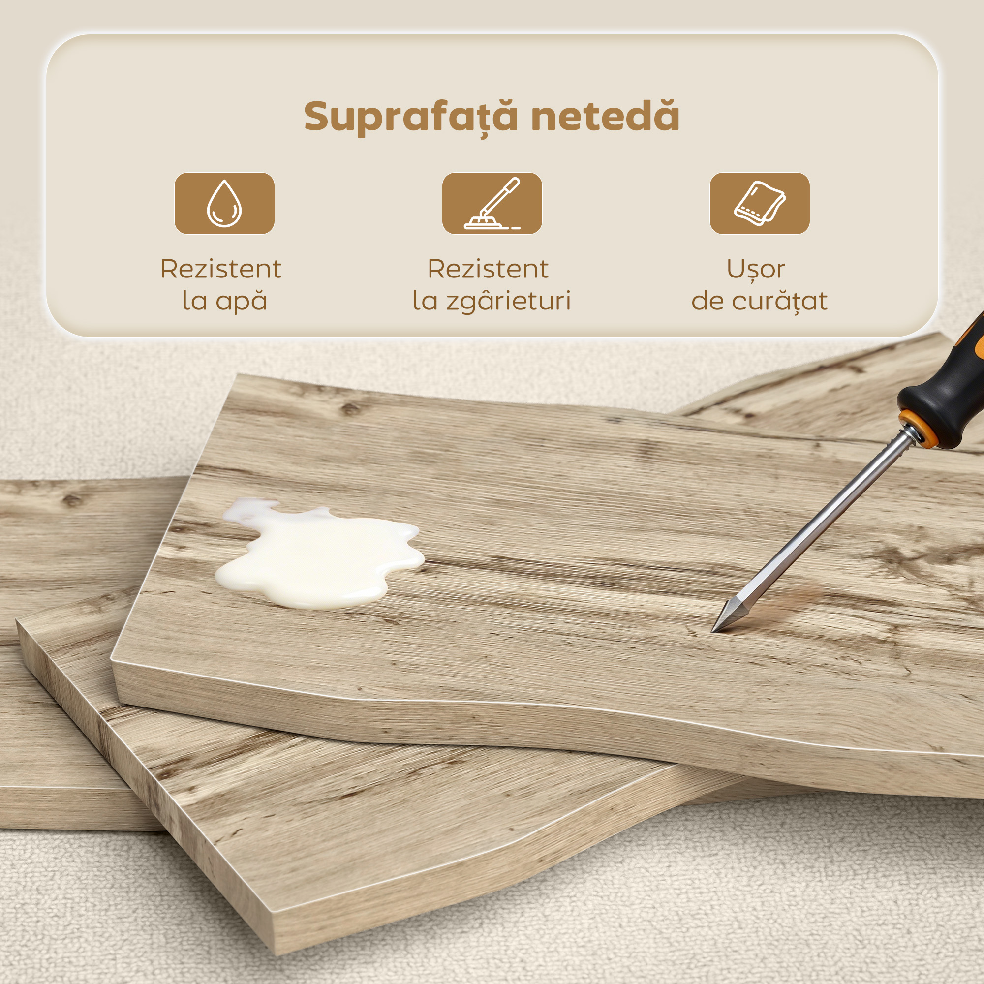 Masa noastra de cafea [BRAND NAME] este piesa ideala pentru a transforma livingul intr-un spatiu de relaxare si ordine, gratie unui blat robust de 4 cm si marginilor rotunjite pentru siguranta. Finisajul elegant cu aspect de stejar si inaltimea de 45 cm o transforma intr-un punct central primitor si intr-un suport practic pentru living, hol sau dormitor, capabil sa sustina bauturi si carti fara probleme.