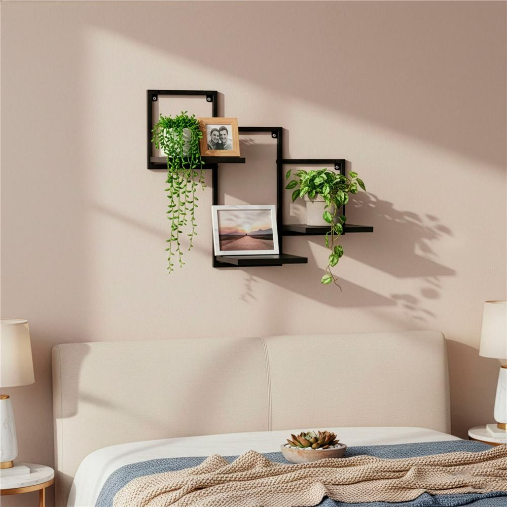 Raft de perete cu trei polite din MDF si structura metalica, conceput pentru organizarea si expunerea obiectelor decorative sau functionale. Designul modern permite integrarea usoara in living, birou sau dormitor.