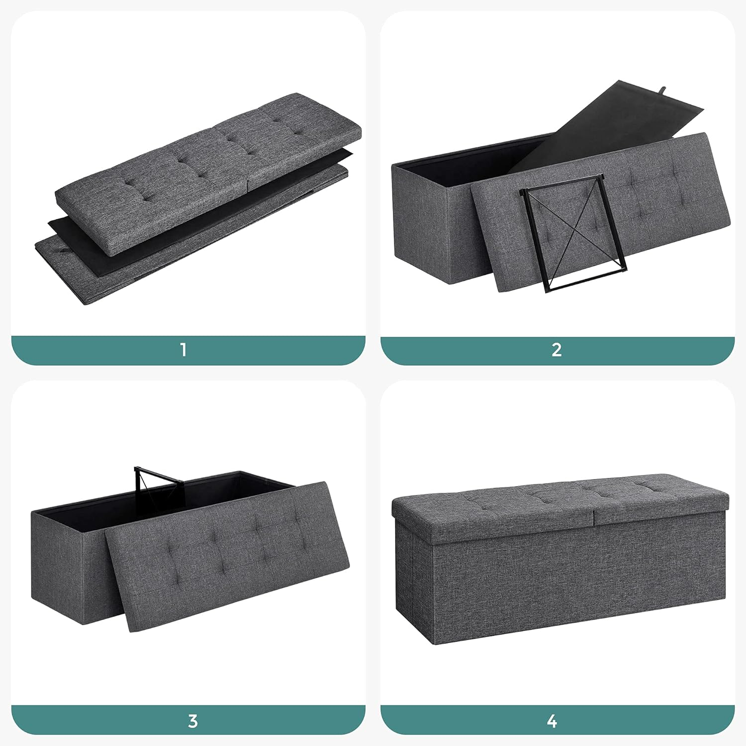Culoare Gri inchis  	 Material: Husa de panza artificiala, placa MDF, cadru de fier  	 Caracteristica speciala: Banca pliabila cu capac cu balamale, spatiu mare de depozitare  	 Stil: Modern    Despre acest articol Banca pliabila cu capac rabatabil - Capacul este rabatabil din ambele parti, convenabil si rapid pentru a scoate sau a introduce articole fara a scoate intregul capac. Cand nu este folosit, il puteti plia si depozita pentru a economisi spatiu.Spatiu mare de depozitare – scaunul cu interior de 120 L ofera suficient spatiu pentru depozitarea oglinzilor, perne, paturi, haine, reviste etc. Adio dezordinei.Robusta si durabila - Banca de piept din panouri MDF (clasa E1) si cadru robust din fier asigura o stabilitate ridicata, ca piesa de mobilier indispensabila, serveste perfect ca banca de pantofi, suport pentru picioare sau canapea extensibila.Capacitate mare de incarcare si confort excelent al scaunului – capacitate max. de incarcare statica: 300 kg. Husa din PVC cu captuseala moale asigura o experienta confortabila de asezare si o curatare usoaraUsor de asamblat si versatil - asamblare rapida in 1. Min. Datorita celor 3 parti simple, ideale pentru living, dormitor, vestiar sau hol.