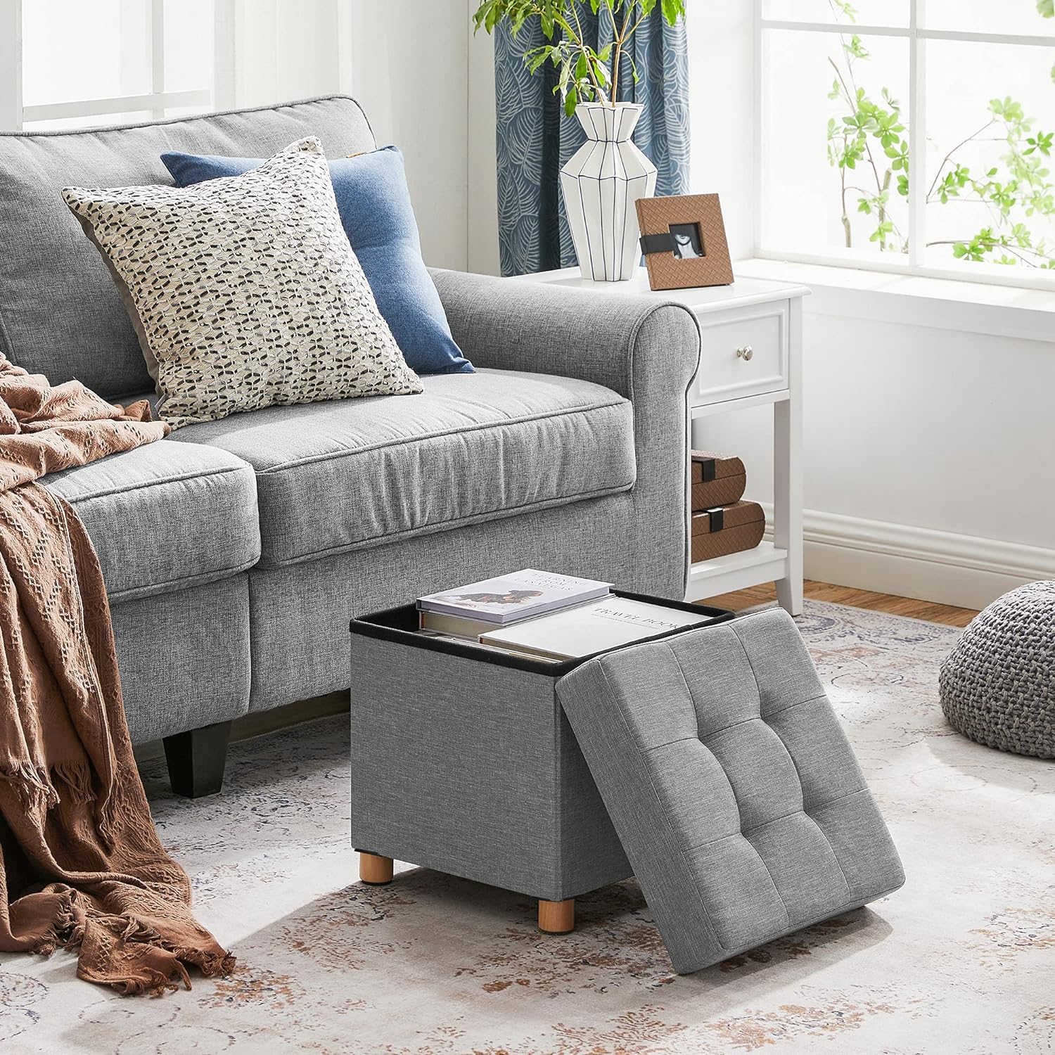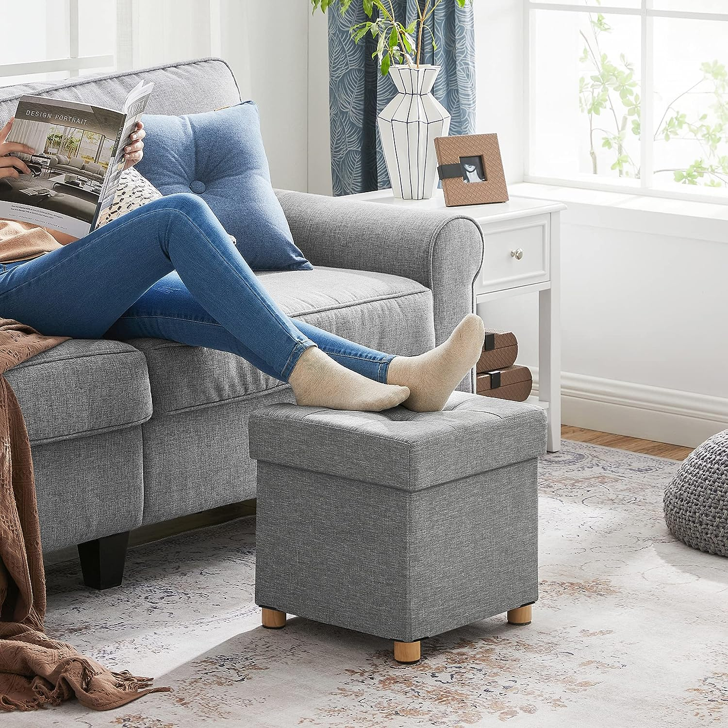 Material: imitatie de in, MDF, spuma, picior de lemn, patina de fier  	 Culoare: Gri  	 Stil: Moderne  	 Dimensiuni: 38 x 38 x 40 cm  	 Inaltimea scaunului: 40 cm  	 Marca: SONGMICS  	 Greutatea articolului: 3.5 Kilograme  	 Greutate maxima recomandata: 300 Kilograme    Despre acest articol INLOCUITI INTERIORUL CU O NOUA BANCA: Spatiu pentru a va depozita asternuturile. Un loc unde sa va odihniti picioarele? Este doar o parte din functiile acestui taburet. Capacul sau captusit in stil Chesterfield are un aspect elegant, iar picioarele din lemn previn contactul direct cu podeaua pentru o depozitare mai curata.Capacitate de incarcare garantata: Datorita structurii sale din placi de fibra de lemn cu o capacitate de incarcare de 300 kg, puteti sta pe el fara nicio problema.PERNE PENTRU PICIOARE MICI, DAR UTILE: Aceasta banca de depozitare este prevazuta cu pernute pentru picioare pentru a preveni alunecarea si pentru a proteja podeaua de zgarieturi. In plus, acestea evita orice zgomot, astfel incat sa nu va deranjeze lectura sau munca atunci cand copiii o misca!Idee magnifica: puneti ordine in casa cu aceasta banca de depozitare practica si eleganta.
