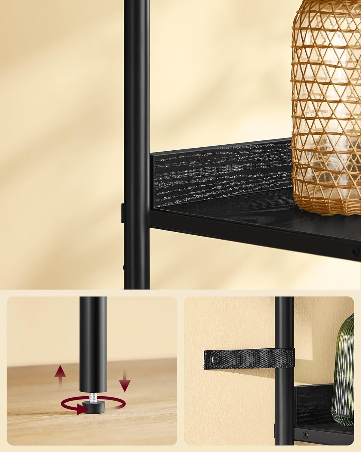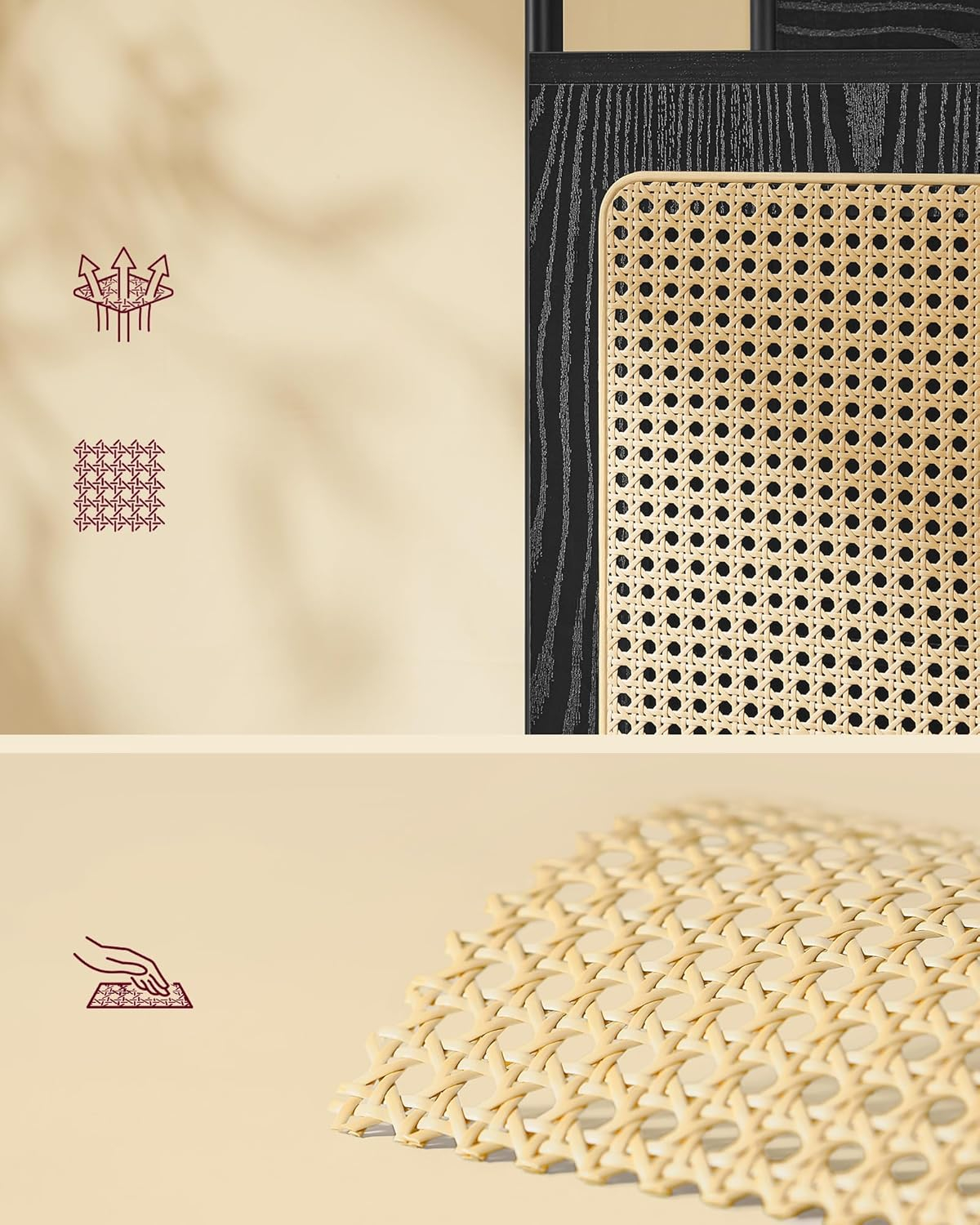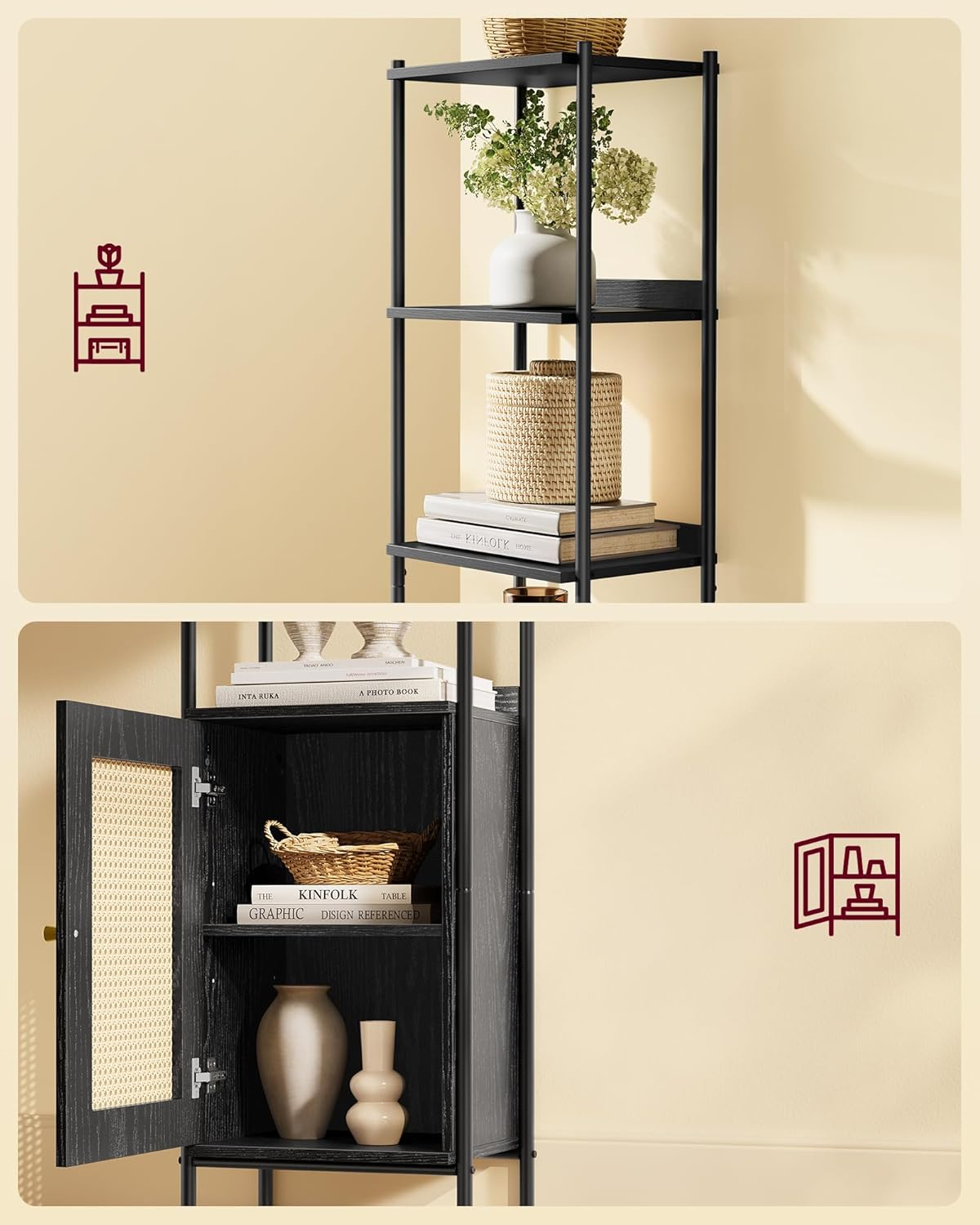 Specificatii:   	 Culoare: Negru mat  	 Material: Otel, placi aglomerate PAL, PE (polietilena) Rattan  	 Dimensiunea produsului: 30 x 40 x 174.7 cm  	 Greutatea produsului: 15,3 kg  	 Max. Capacitate de incarcare statica pe nivel: 10 kg  	 In total Max. Capacitate de incarcare statica maxima: 60 kg   Note:   	 Din motive de siguranta, va rugam sa atasati acest dulap de depozitare la perete folosind protectia anti-inclinare inclusa.        Despre acest articol Infuzati un vibe bohomian trait in spatiul dvs. cu aceasta biblioteca. Paleta sa neagra linistitoare, asociata cu o usa de dulap asemanatoare cu cea din rattan, emana o nota aerisita si relaxata care va ridica orice spatiu modern sau va completa un decor boho. Spatiu vertical maximizat:  Aceasta biblioteca, cu silueta sa subtire de 30 x 40 x 174,7 cm, ofera spatiu de depozitare vertical amplu pentru a va mentine casa organizata, ocupand in acelasi timp o amprenta minima. Raftul reglabil din dulap se potriveste articolelor de diferite dimensiuni. Utilizare versatila:  Fie ca doriti sa expuneti obiecte de arta in camera de zi, sa depozitati carti in birou sau sa ascundeti lenjeria de pat in dormitor, aceasta unitate de rafturi va acopera. Depozitarea deschisa si inchisa va permite sa expuneti ceea ce doriti si sa ascundeti ceea ce nu doriti. Stabil si sigur:  Acest raft de depozitare este prevazut cu picioare reglabile pentru echilibru pe suprafete inegale si un kit anti-basculare care previne rasturnarea pentru un spatiu de locuit mai sigur. In plus, panourile din spate impiedica alunecarea obiectelor, pastrandu-va bunurile in siguranta. Usor de asamblat:  Nu este nevoie sa va stresati cu asamblarea! Instructiunile clare si piesele marcate fac asamblarea acestei unitati de rafturi de depozitare foarte usoara.