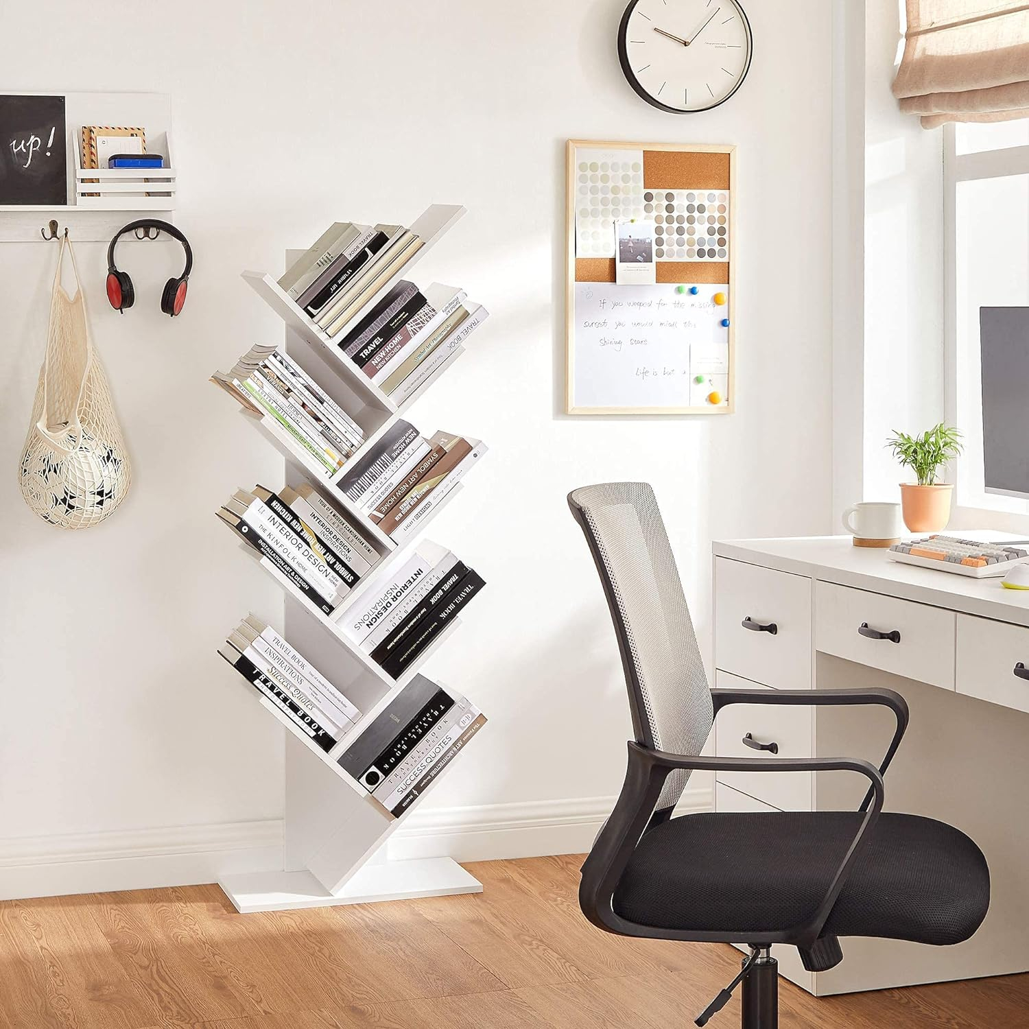 Specificatii:   	 Culoare: alb  	 Material: PAL  	 Dimensiunile produsului: 50 x 25 x 141,5 cm (L x P x H)  	 Greutate: 13 kg  	 Capacitatea de incarcare a fiecarui raft: 10kg    Despre acest articol  Raft pentru iubitorii de carti:  Cu o silueta geometrica si o functie exceptionala, acest raft de carti in forma de copac este un element luminos in biroul dvs. de acasa; umpleti ramurile cu cartile dvs. preferate pentru a crea un afisaj atragator. Pentru spatii mici : Biblioteca are 8 rafturi deschise si poate gazdui o multime de carti (format A4 si A5) si alte ornamente, ocupand in acelasi timp doar o suprafata mica de podea; cu dimensiuni de 50 x 25 x 141,5 cm (L x l x i), perfecta pentru apartamente, spatii inguste, sali de clasa sau colturi. Stabilitate remarcabila:  Placile aglomerate si feroneria de calitate asigura o structura robusta si durabila; include un dispozitiv anti-inclinare pentru o stabilitate sporita, fiecare raft suporta pana la 10 kg. Usor de asamblat:  Vine cu piese numerotate si instructiuni ilustrate, usor pentru o singura persoana sa monteze acest raft de carti fara a avea nevoie de asistenta.