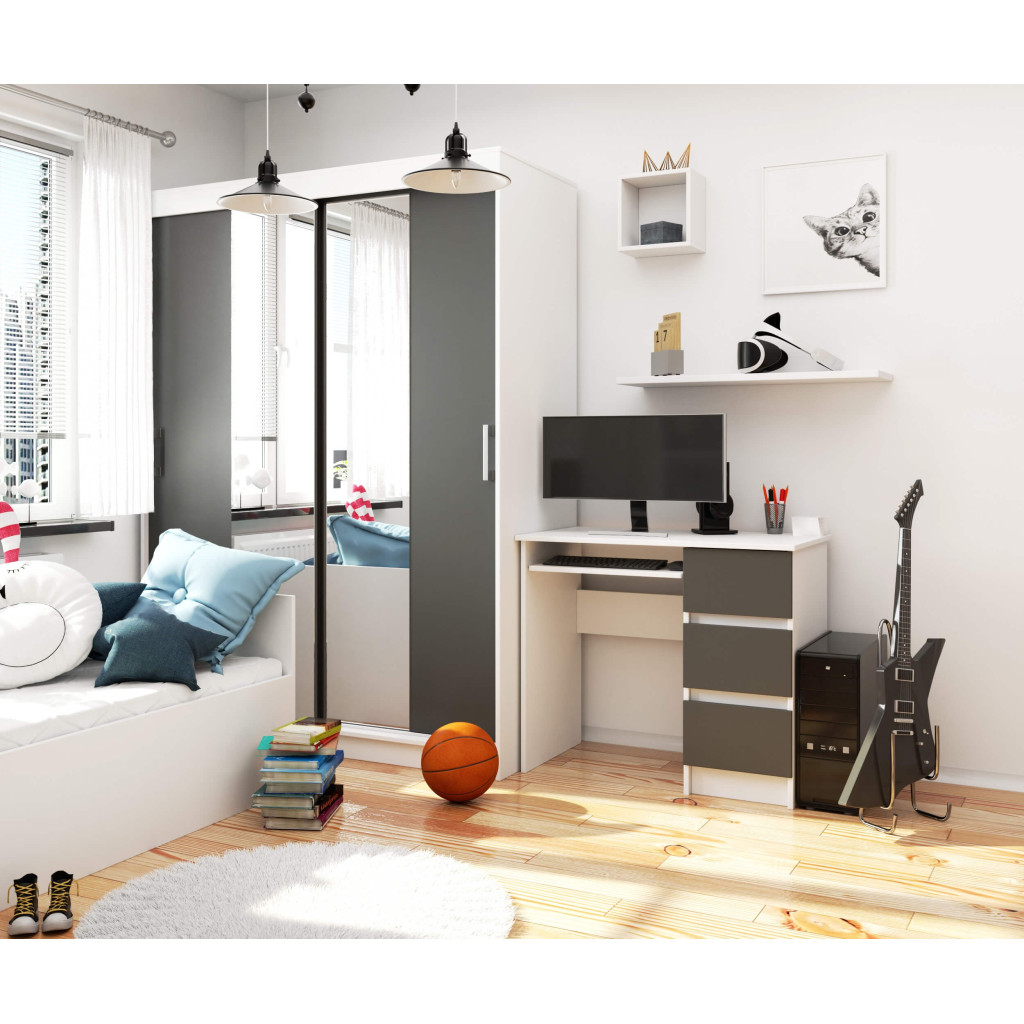 Specificatii tehnice Tip produs: Birou computer Model: A-6 Culoare: Alb/gri grafit Material: Placa laminata rezistenta la uzura Margini: Protejate cu banda ABS Numar sertare: 3 Functii suplimentare: Raft glisant pentru tastatura Dimensiuni: 90 x 50 x 77 cm (L x A x I) Grosime placa: 16 mm Scurta descriere Biroul computer A-6 drept imbina eleganta minimalista cu functionalitatea moderna. Cu un design compact si finisaj in alb si gri grafit, se integreaza perfect in orice spatiu – de la camera de tineret la biroul de acasa. Cele trei sertare spatioase si raftul glisant pentru tastatura ofera confort si ordine in timpul lucrului sau studiului. Constructia din placa laminata de calitate, completata cu margini protejate prin banda ABS, asigura durabilitate si rezistenta la uzura zilnica. Caracteristici principale Design modern in alb si gri grafit Trei sertare practice pentru depozitare Raft glisant pentru tastatura Blat dreptunghiular si structura stabila Material rezistent la uzura si zgarieturi Margini protejate cu banda ABS Montaj usor, cu instructiuni incluse