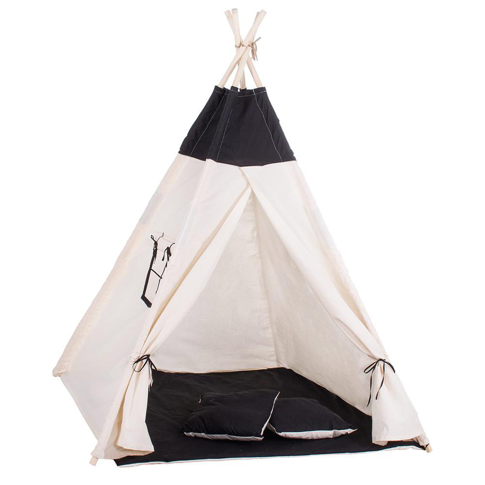 Cort copii Sersimo stil indian Teepee Tent cu fereastra, covoras gros si 2 perne, alb negru