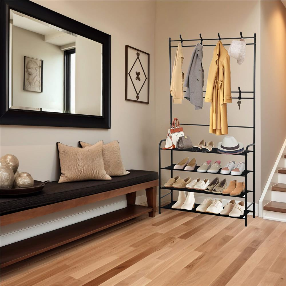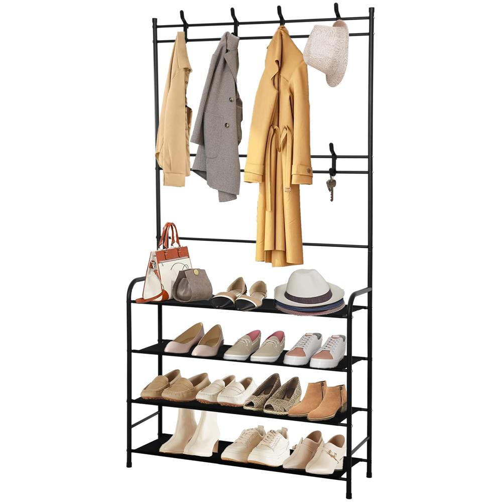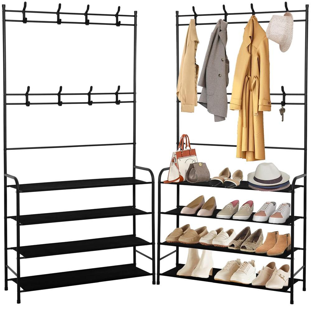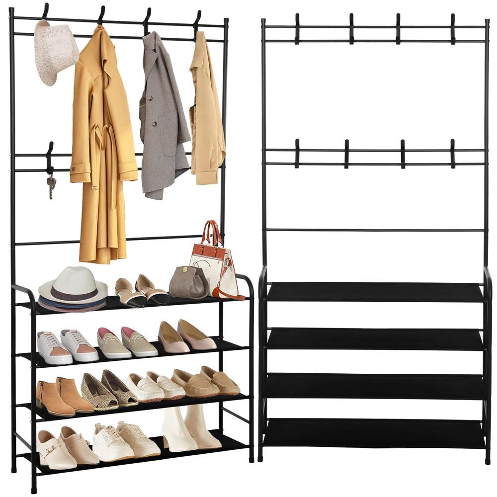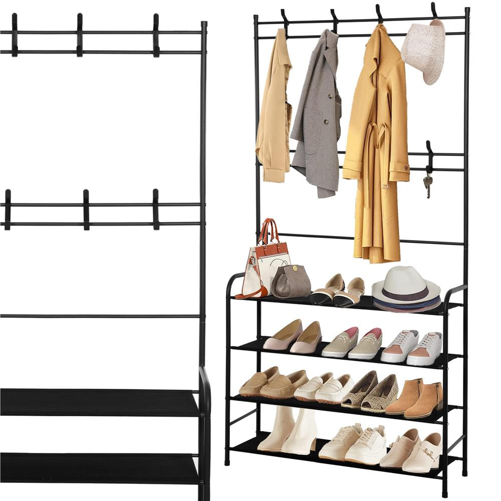 Culoare neagra  	 Material: metal + stofa  	 Numar de rafturi pentru pantofi: 4  	 Numar de umerase duble mobile: 8  	 Produs pentru auto-asamblare  	 Marimea:  	 Inaltime totala: 150 cm  	 Lungime totala: 80 cm  	 Adancime totala: 25 cm   Umerasul este realizat din elemente de otel, vopsit cu pulbere intr-o culoare neagra la moda si universala , cu un finisaj mat, iar rafturile sale pentru pantofi sunt din material negru puternic. Forma sa simpla este o combinatie de minimalism si functionalitate care se potriveste perfect atat in interioarele clasice, cat si in cele de tip loft.   	 Design practic - doua niveluri de umerase, patru rafturi pentru pantofi  	 Asamblare usoara si rapida  	 Va functiona excelent si in hol/hol.   Cu opt umerase duble pe doua niveluri diferite si patru rafturi care pot fi folosite pentru a depozita pantofi, umerasul nostru ofera suficient spatiu pentru a depozita haine de diferite marimi si lungimi. Umerasele sunt mobile - pot fi deplasate de-a lungul tuburilor orizontale si pot fi scoase si schimbate - asezati pe fiecare nivel cate umerase aveti nevoie!